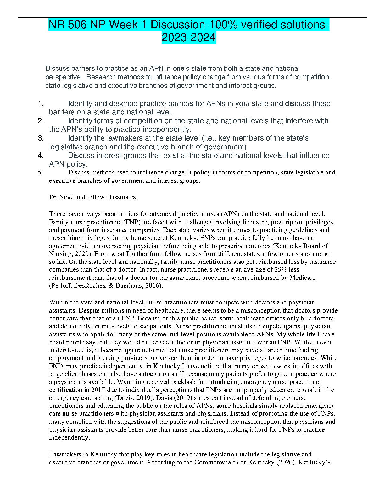 This resource provides verified solutions to the NR 506 NP Week 1 discussion, focusing on the barriers to practicing as an APN in a specific state. It delves into state and national perspectives, explores the role of interest groups, and discusses methods to influence policy changes. This material is designed to help students achieve success on their first attempt, avoiding resits.