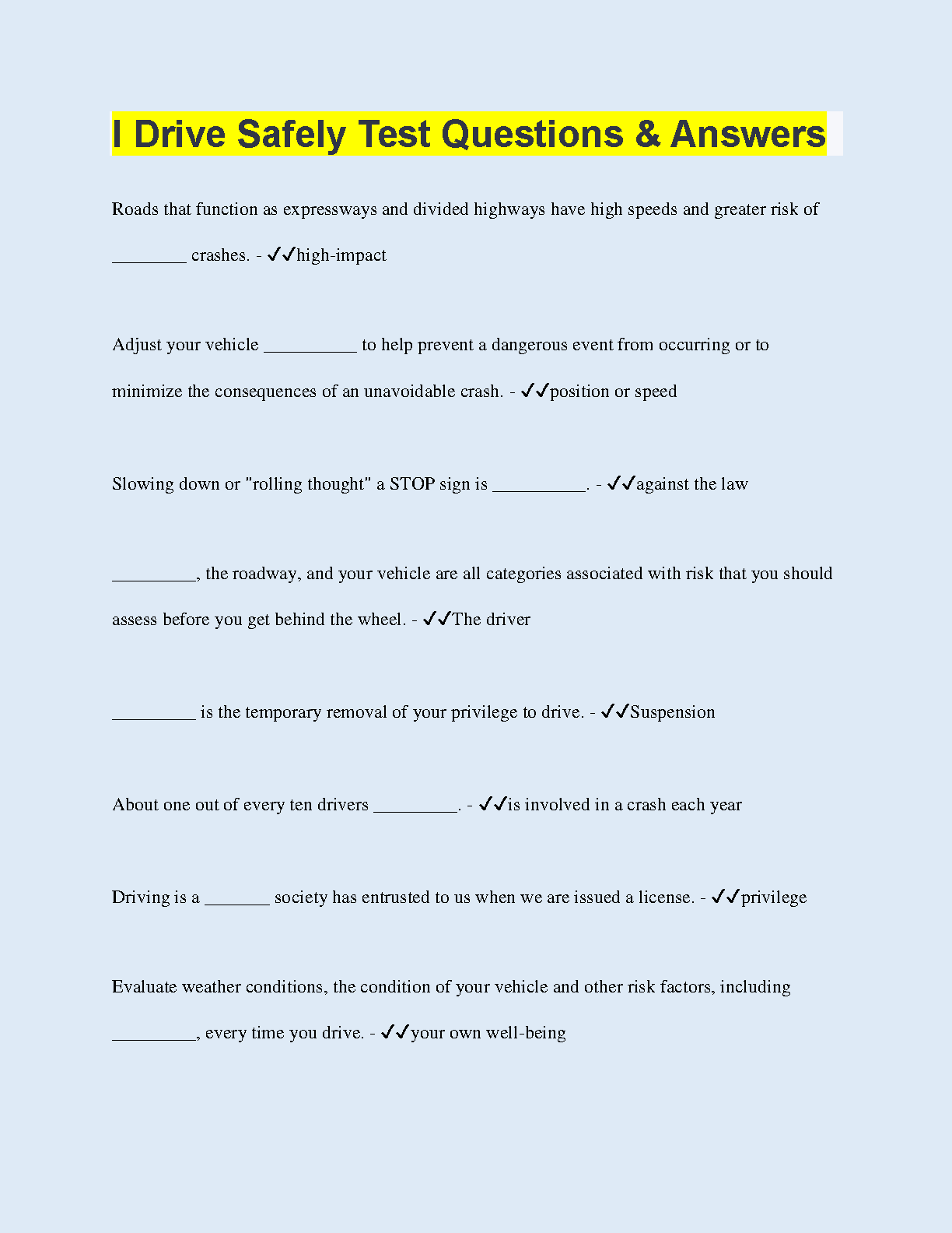 This Drive Safely Test Questions and Answers resource is designed to help students master the essential concepts and regulations related to safe driving practices. With comprehensive coverage of key topics, including driving safety, road rules, and vehicle maintenance, this resource will guide students through the material in a clear and concise manner, equipping them with the knowledge and skills necessary to pass the test on their first attempt and avoid any potential resits.