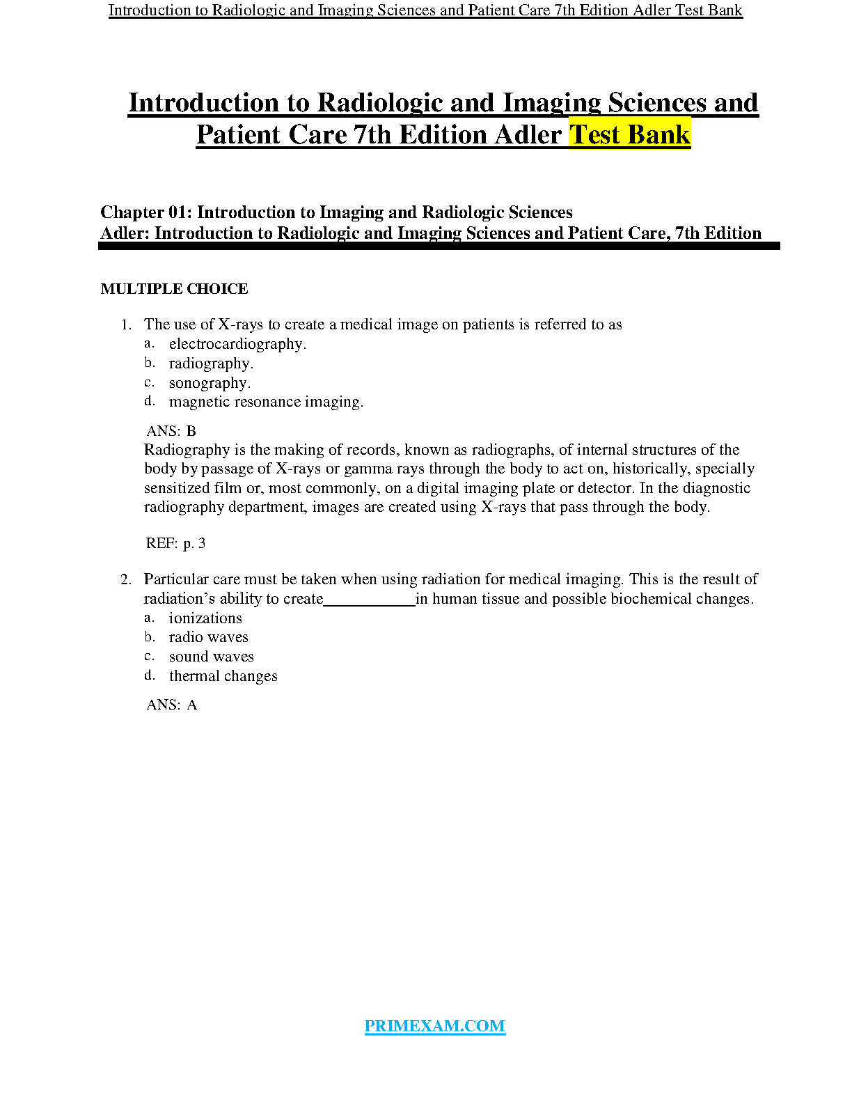 This is the test bank for the 7th edition of Introduction to Radiologic and Imaging Sciences and Patient Care by Adler. It contains multiple choice questions and answers to help you prepare for exams.