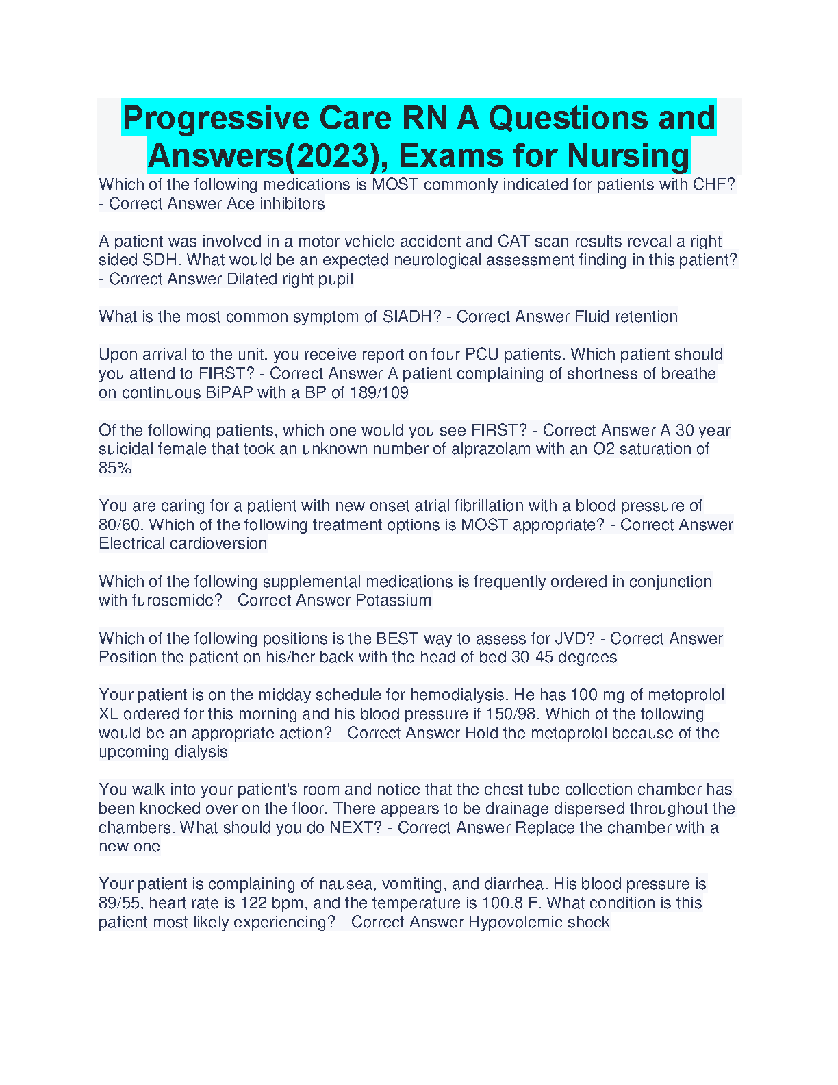 This is a compilation of comprehensive questions and answers related to Progressive Care RN A for the 2024/2025 academic year, designed to help nursing students ace their exams on the first attempt. The resource covers essential topics and concepts that are frequently tested, ensuring a solid understanding of critical care concepts.