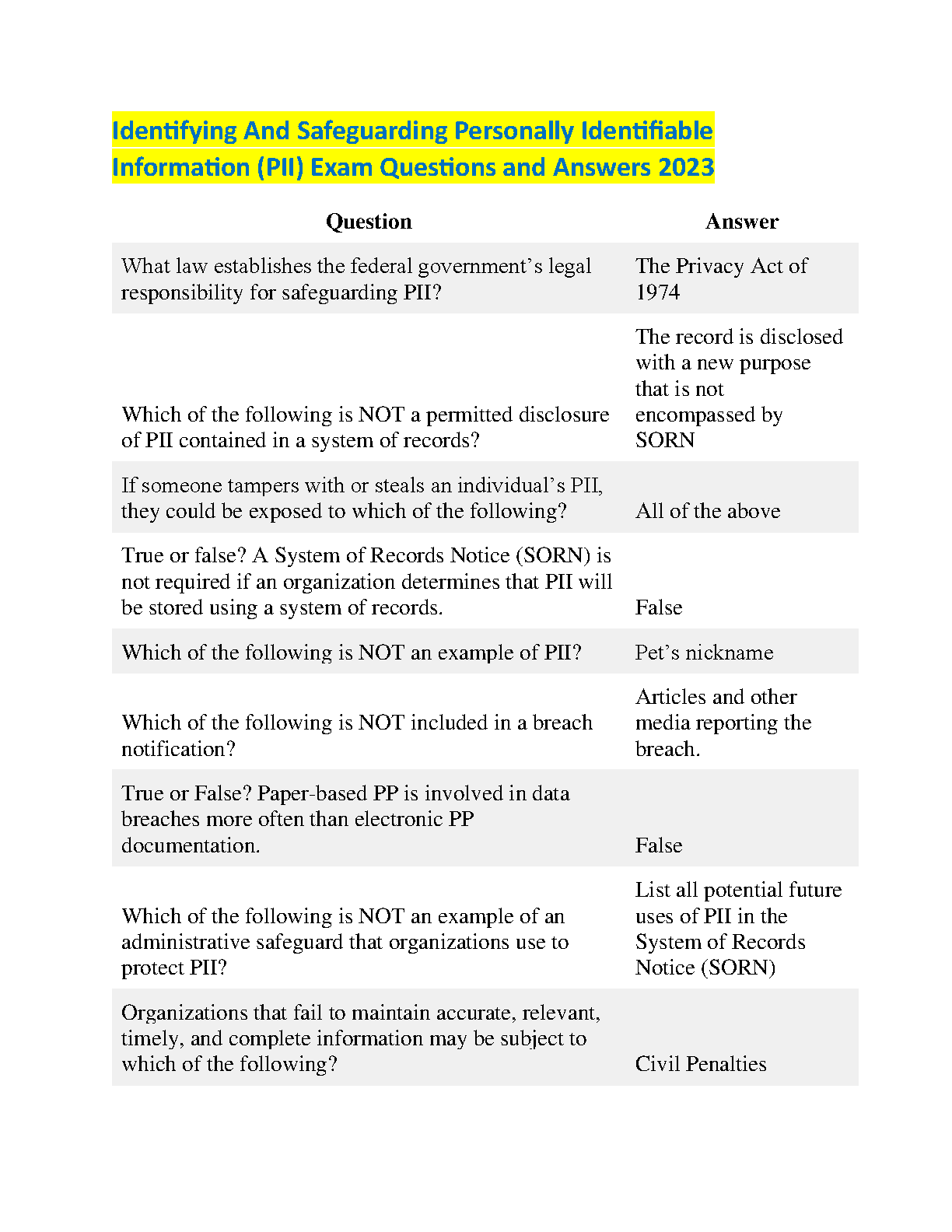 Identifying And Safeguarding Personally Identifiable Information (PII) Exam Questions and Answers 2023
