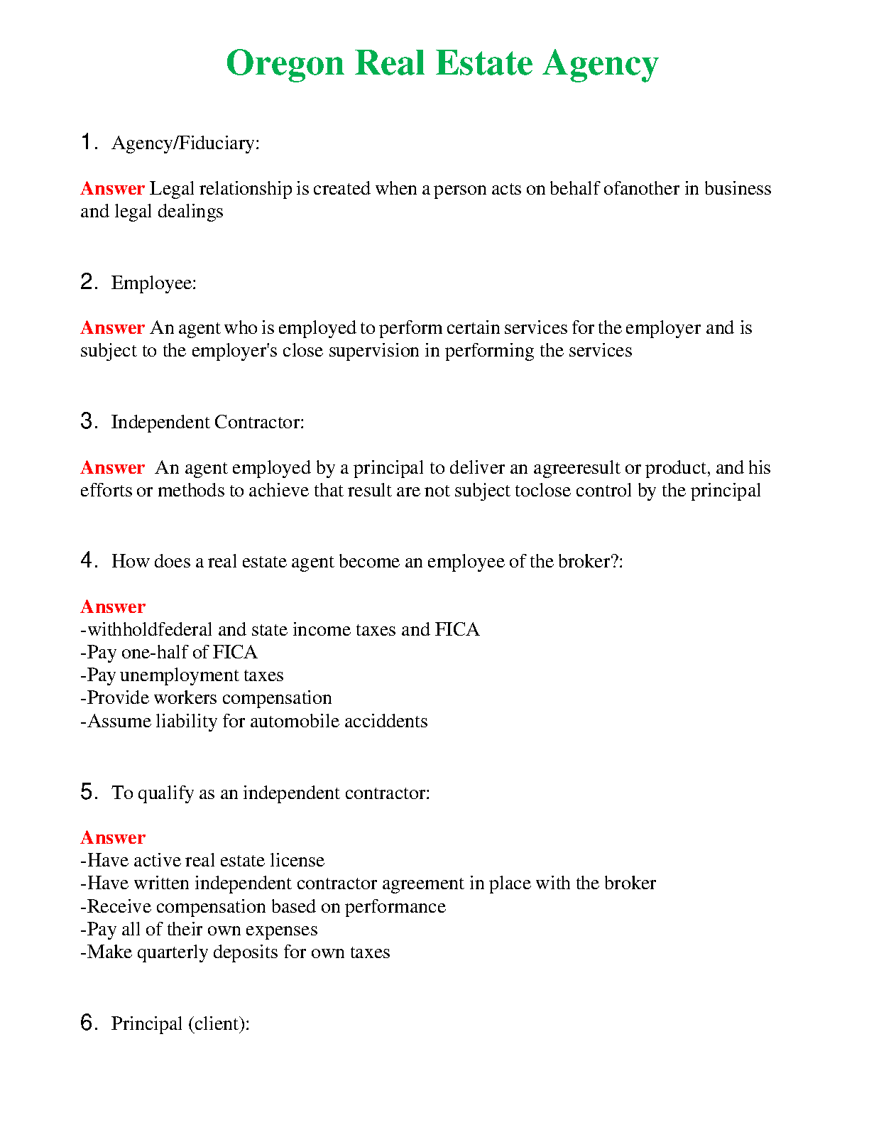 This resource provides a comprehensive overview of Oregon Real Estate Agency and Fiduciary relationships. It covers key concepts such as Agency/Fiduciary, Employee, Independent Contractor, and the requirements to qualify as an independent contractor.