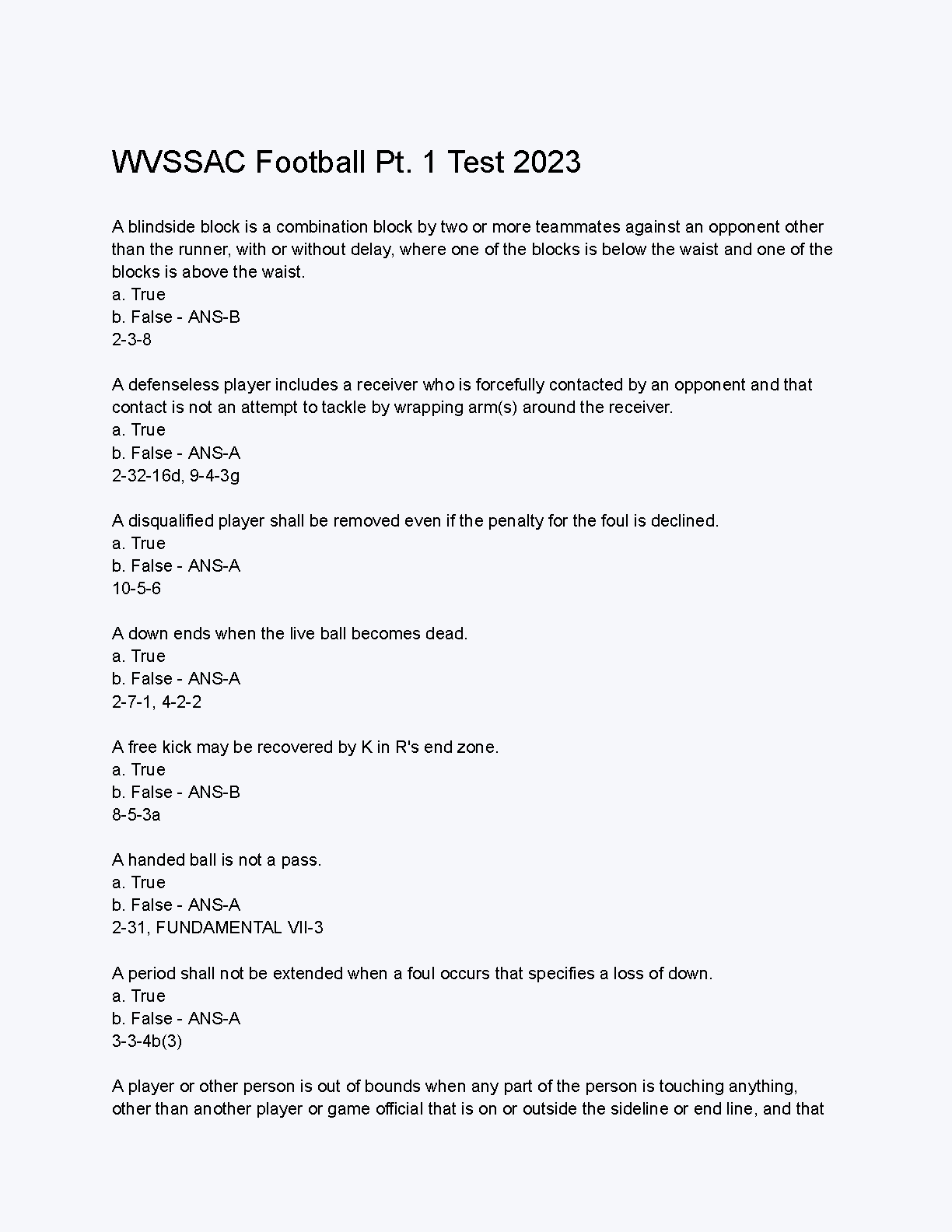 Get ahead in your WVSSAC Football Pt. 1 class with this comprehensive test bank. This resource will help you prepare for your exams and avoid resits, ensuring you succeed on the first try.