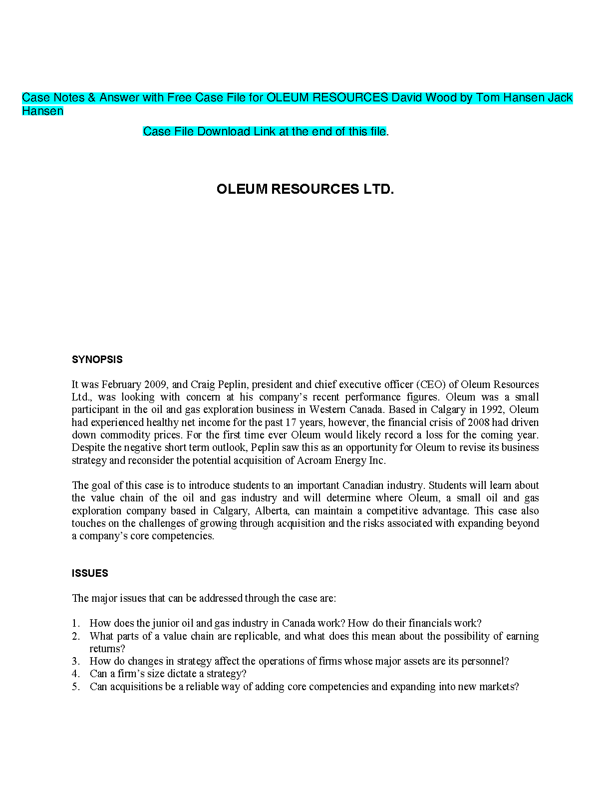 This valuable resource provides students with a comprehensive guide to understanding the Oleum Resources Ltd. case. It features detailed case notes, an insightful answer, and a free case file, making it an indispensable tool for academic success. The case focuses on the oil and gas industry in Canada, offering real-world insights into business challenges, strategic decision-making, and the complexities of growth through acquisition.