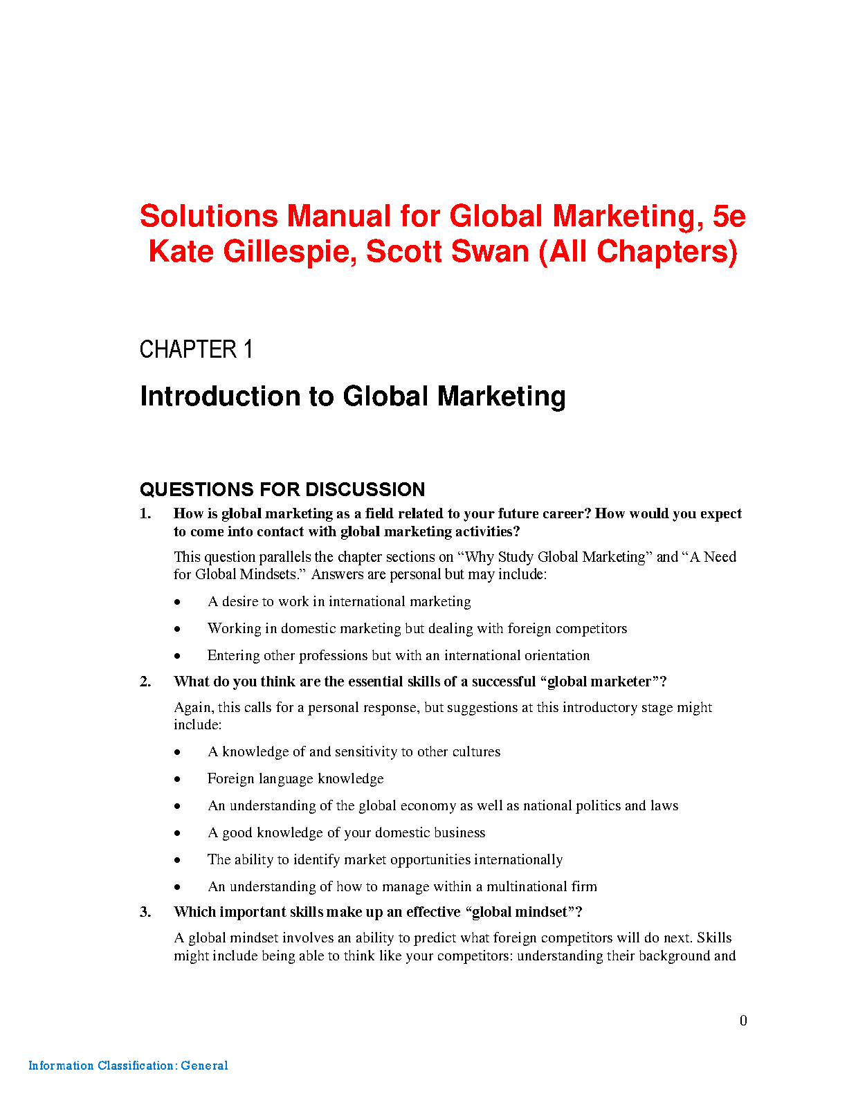 Comprehensive solutions manual for Global Marketing, 5th Edition by Kate Gillespie, Scott Swan. This resource covers all chapters and provides detailed answers to end-of-chapter questions, ensuring a thorough understanding of the concepts.