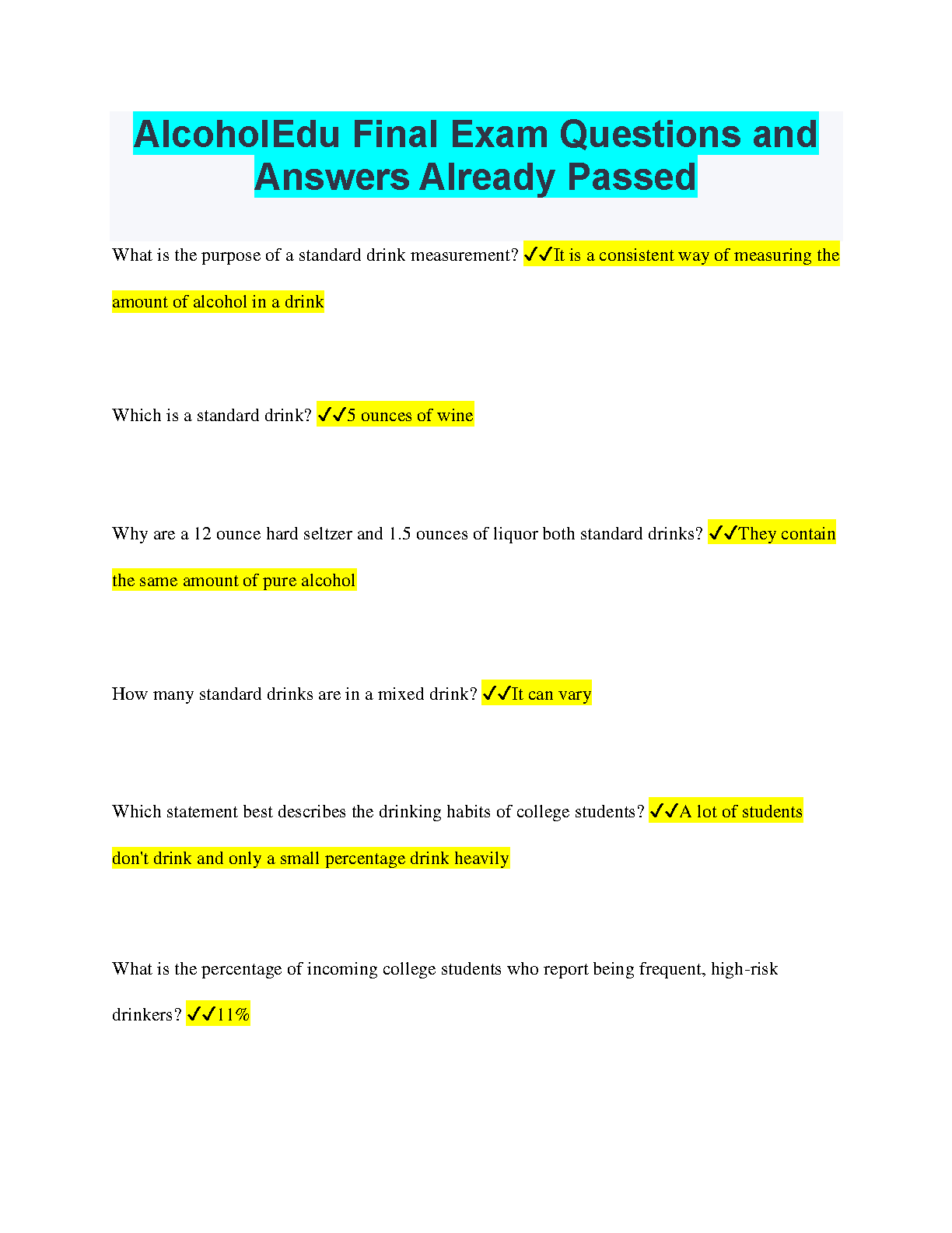 Ace your AlcoholEdu Final Exam with this comprehensive study guide. This resource is tailored to help you understand the key concepts and pass your exam effortlessly. Get access to the most up-to-date questions and answers and avoid resits with this comprehensive guide.