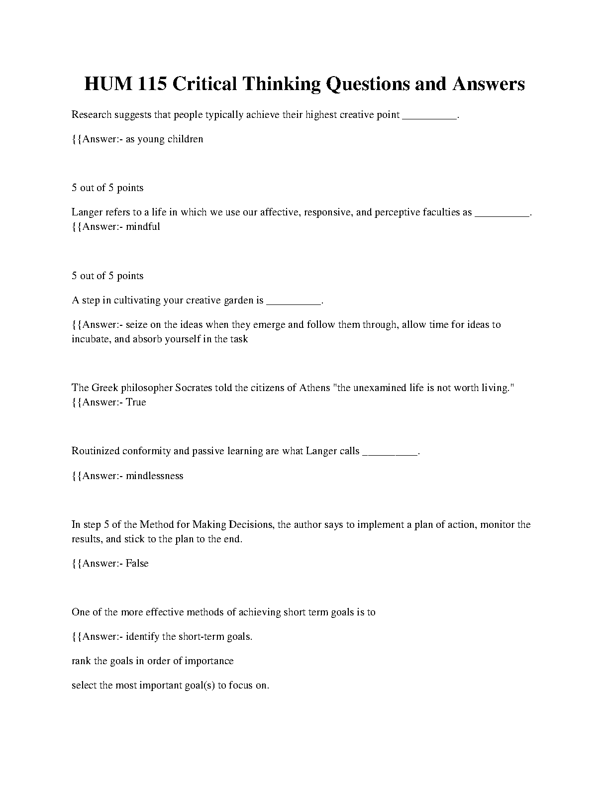 HUM 115 Critical Thinking Questions and Answers