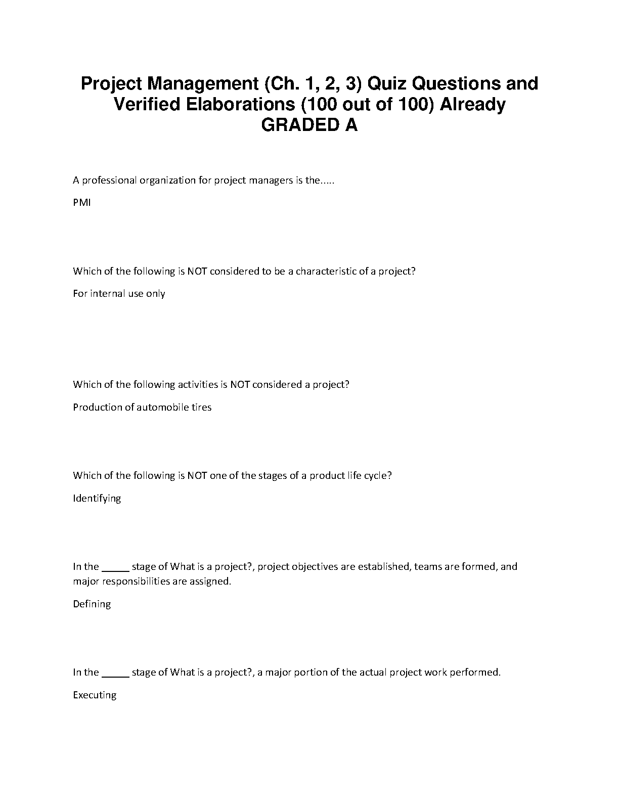 Project Management (Ch. 1, 2, 3) Quiz Questions and Verified Elaborations (100 out of 100) Already GRADED A is a valuable resource for students studying Project Management, offering comprehensive quiz questions and detailed elaborations to ensure a thorough understanding of the concepts. This resource will help students pass exams on their first attempt.
