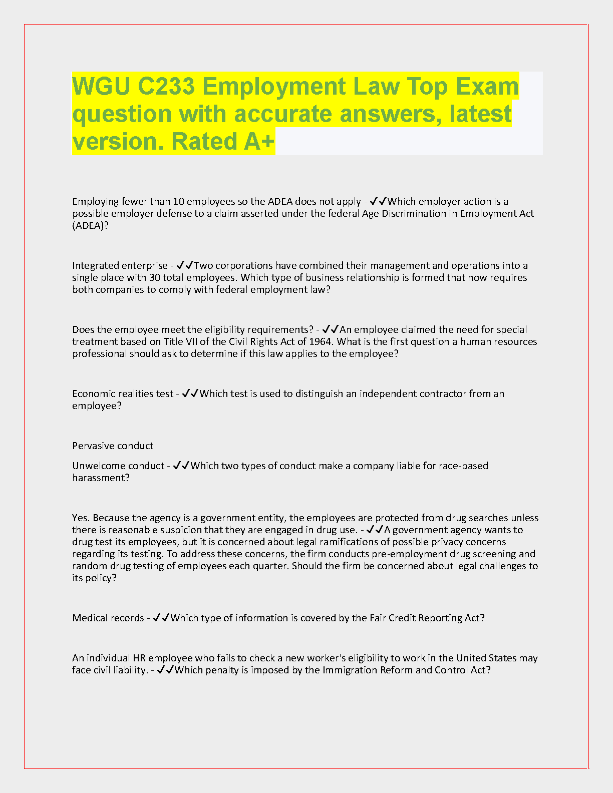 Ace your WGU C233 Employment Law exam with this comprehensive study guide, providing accurate and up-to-date answers to the most important questions. This resource will help you avoid resits and achieve a strong understanding of employment law.