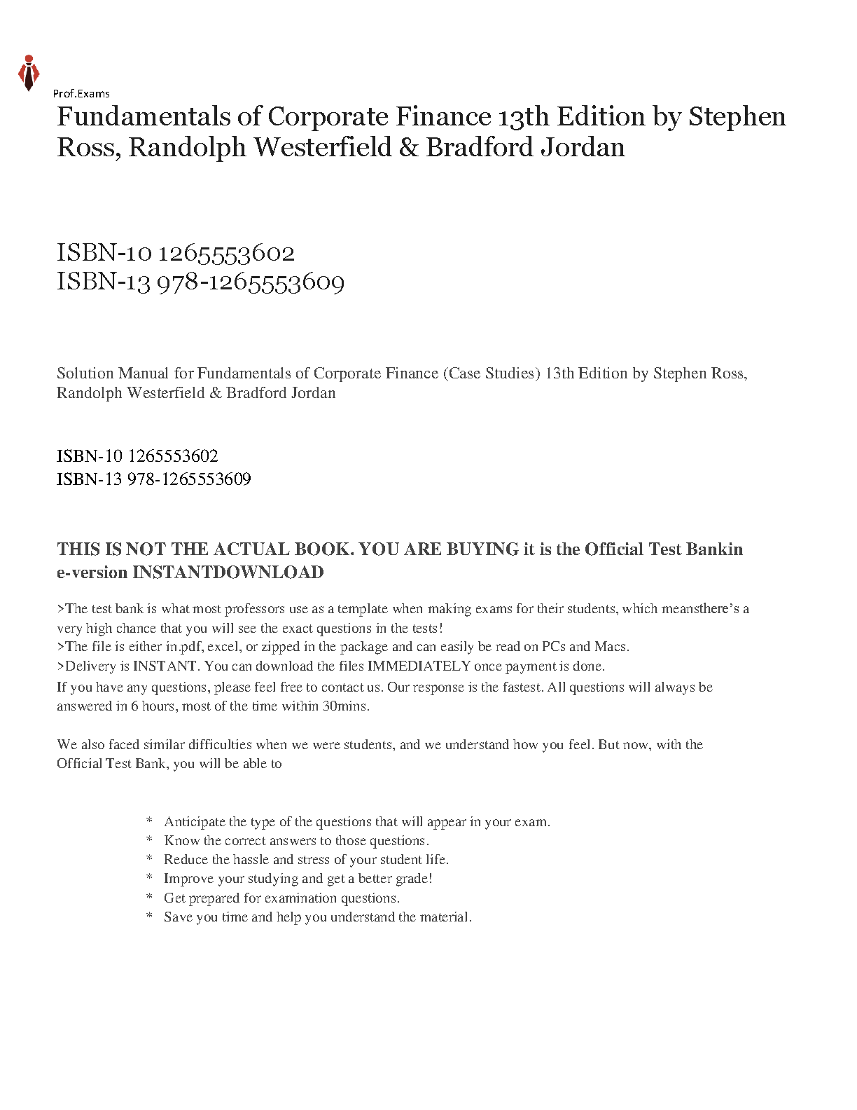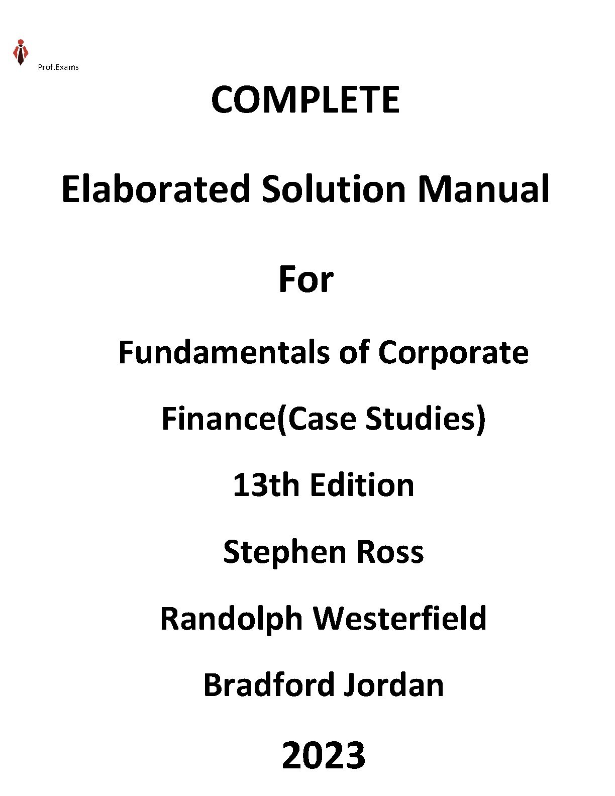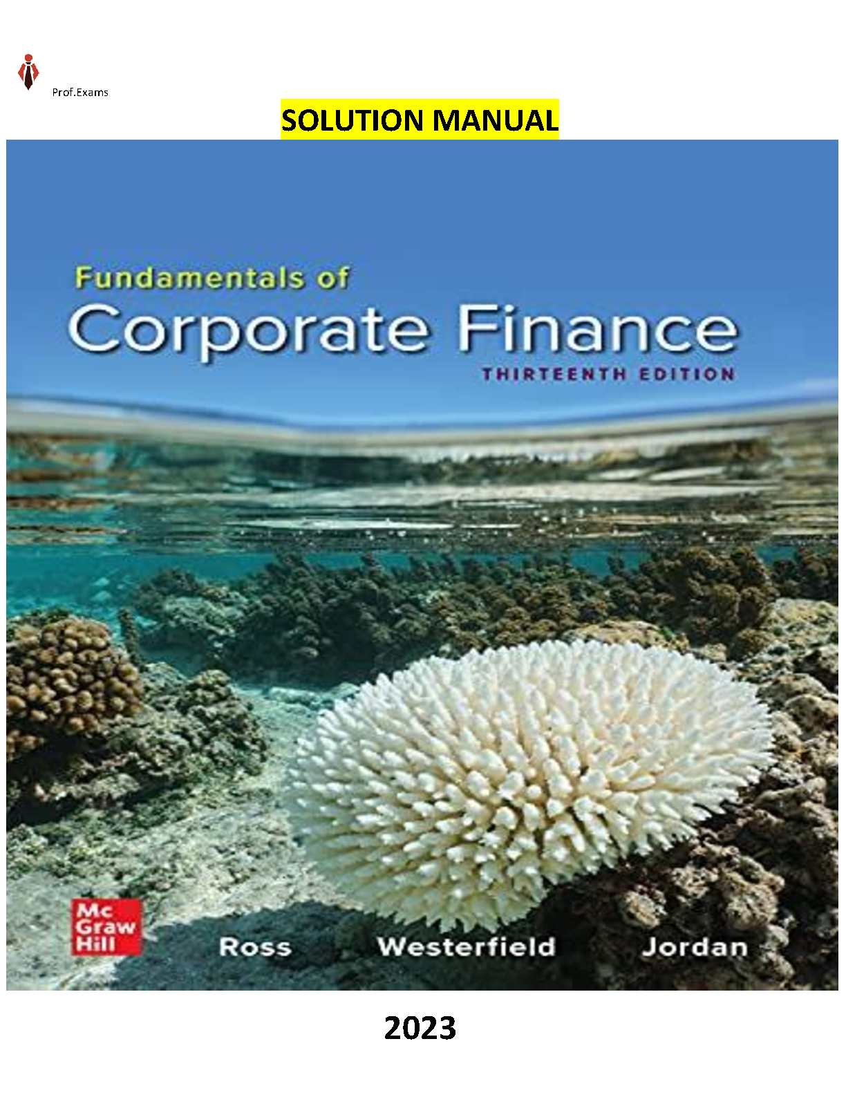Get your hands on the comprehensive solution manual for Fundamentals of Corporate Finance, 13th Edition by Ross, Westerfield, and Jordan. This invaluable resource will help you master every concept and problem in the textbook, ensuring a solid understanding of financial principles. Boost your grades, ace your exams, and gain a competitive edge in your finance education.