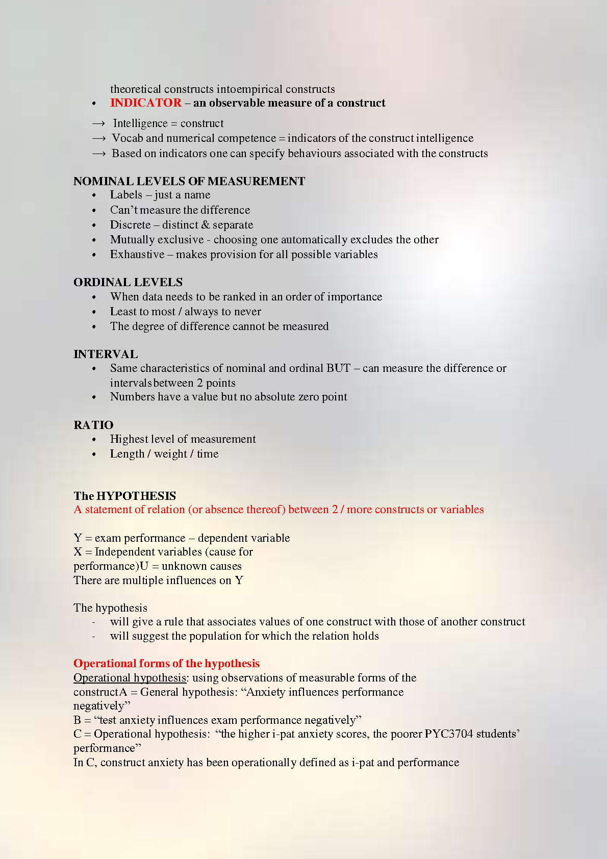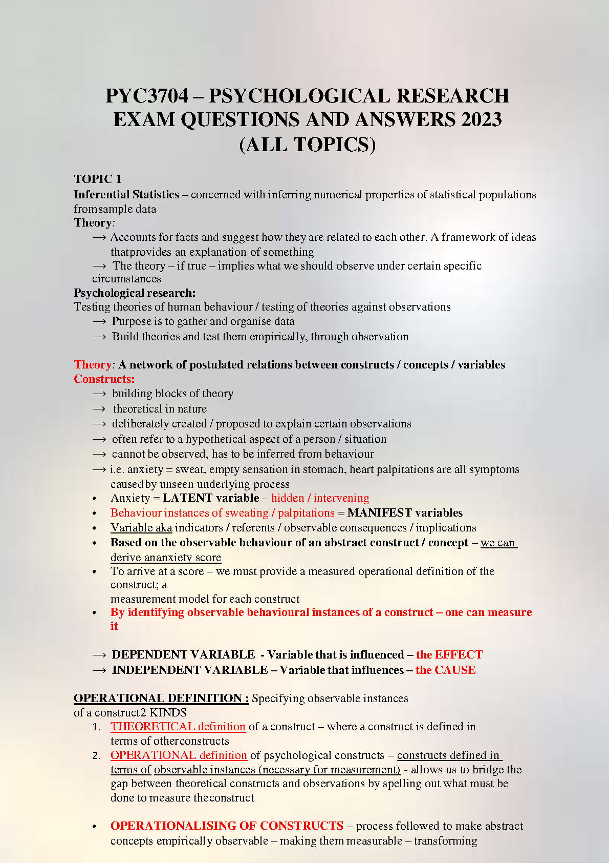 Prepare for your PYC3704 Psychology Research exam with this comprehensive study guide. This resource includes exam questions and answers covering all topics. Gain a solid understanding of inferential statistics, theoretical constructs, operational definition, and more. This study guide is perfect for students looking to pass the exam on their first attempt.