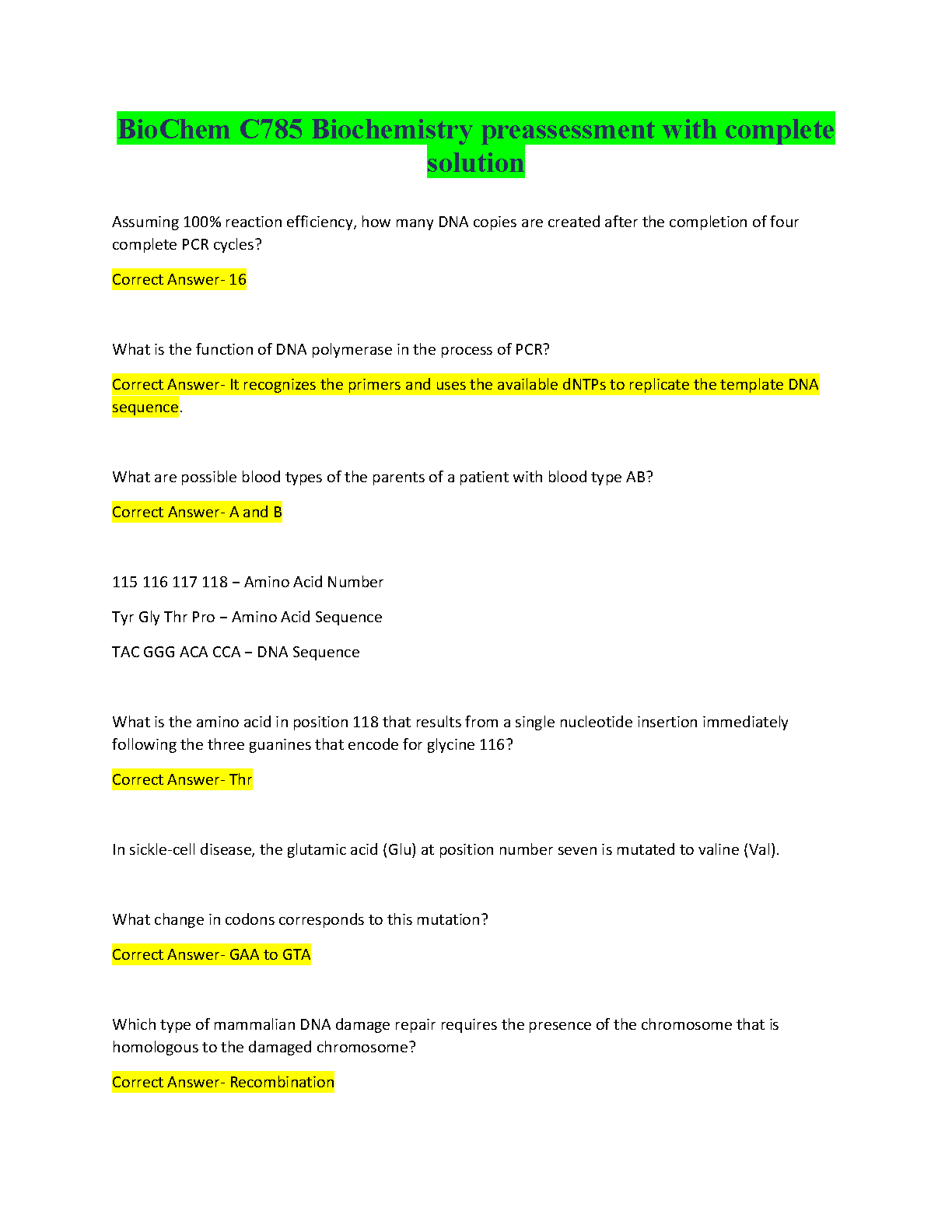 This comprehensive BioChem C785 Biochemistry Preassessment with Complete Solution is designed for the 2024/2025 academic year. It's packed with detailed explanations and answers, covering key concepts in biochemistry to help you ace your exam on the first attempt and avoid resits. Get ready to conquer your biochemistry course with confidence!