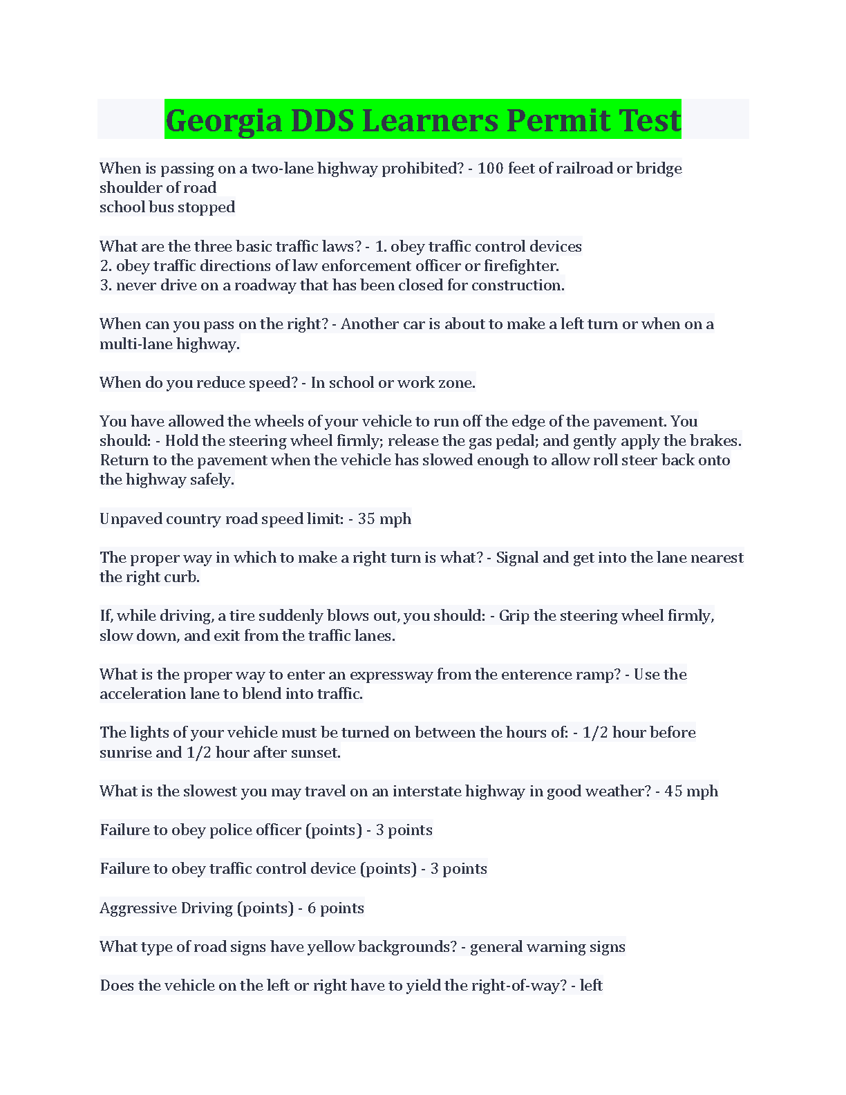 Georgia DDS Learners Permit Test - Practice Questions for 2024-2025