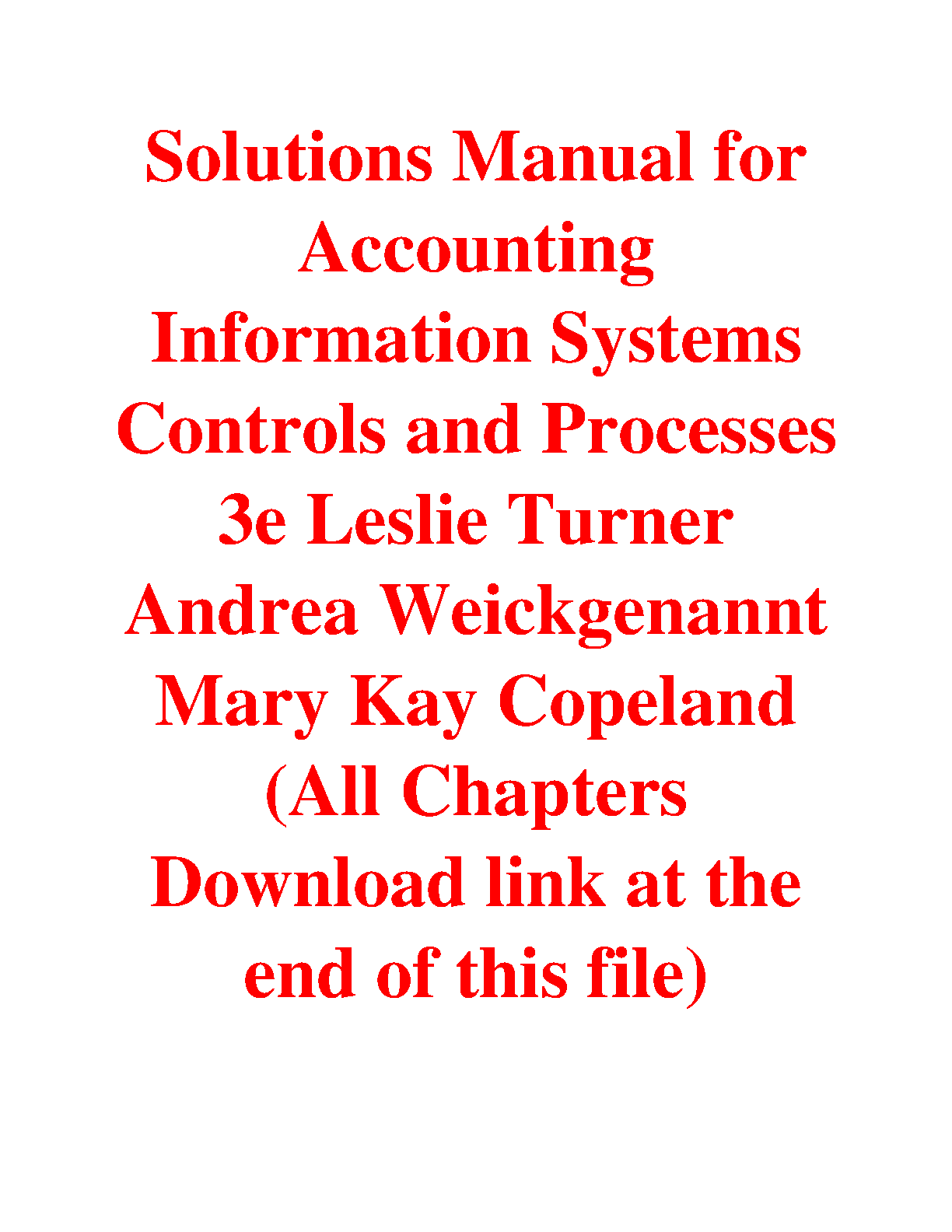Accounting Information Systems Controls and Processes 3e Solutions Manual by Leslie Turner, Andrea Weickgenannt, Mary Kay Copeland - All Chapters is the perfect resource for students who want to ace their accounting exams and avoid resits. This comprehensive guide provides solutions to all chapters of the textbook, helping you understand the concepts and prepare for any test.