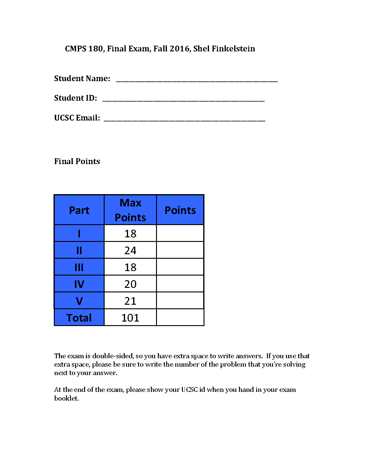 This is a final exam for the CMPS 180 course taught by Shel Finkelstein at the University of California, Santa Cruz. The exam is double-sided and consists of five parts with a total of 101 points.