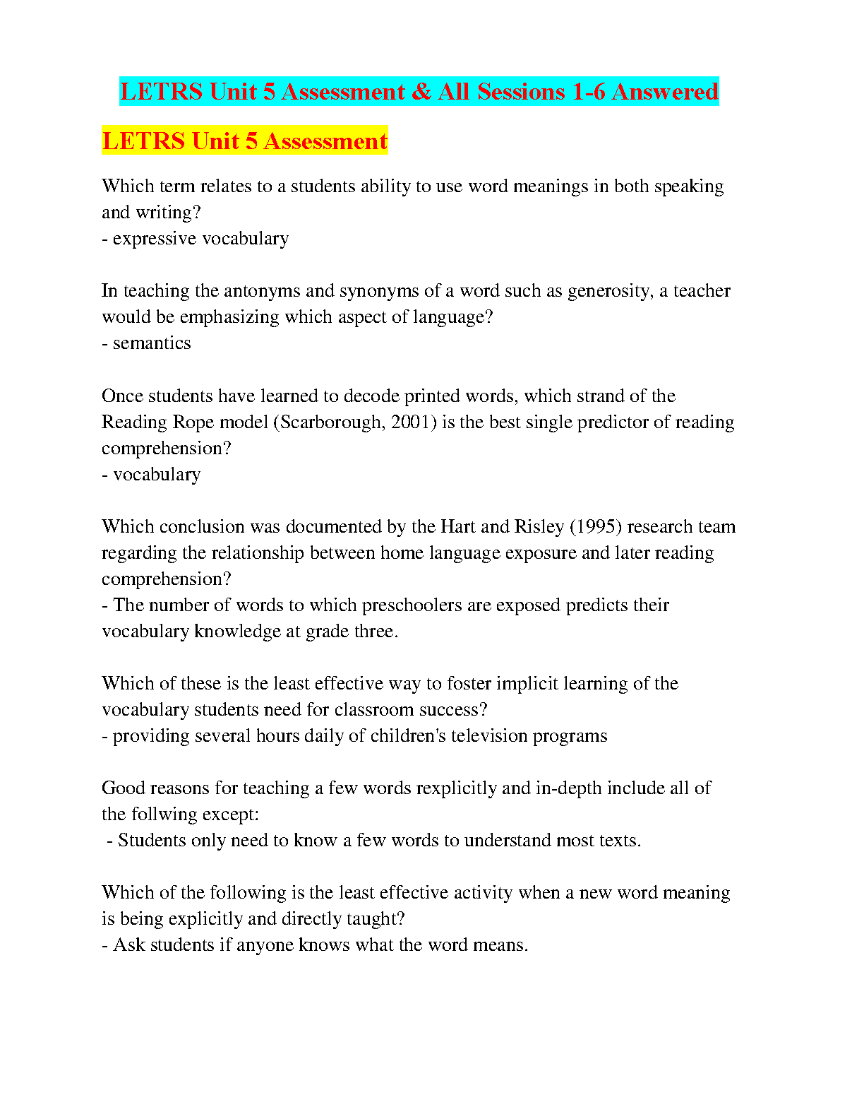 LETRS Unit 5 Assessment & All Sessions 1-6 Answered - Edition 2023