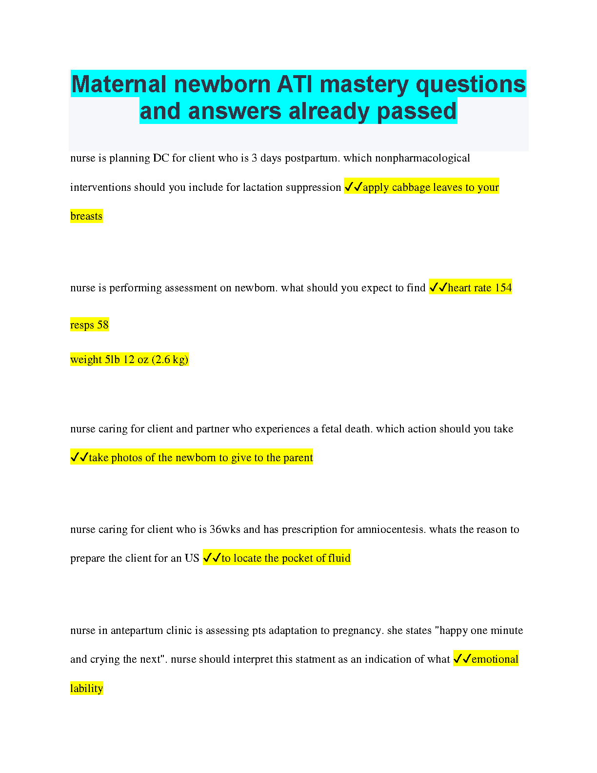 Ace your Maternal Newborn ATI exams with these comprehensive study materials! Our carefully curated questions and answers cover all the essential concepts, helping you master the subject and avoid resits. Get ready to conquer your exams with confidence!