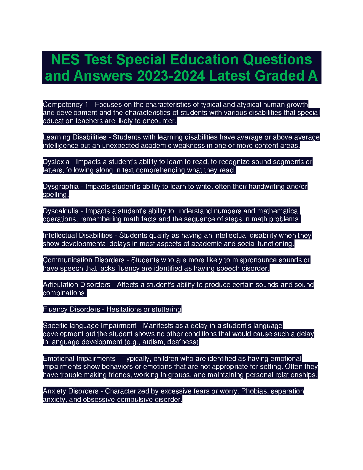 NES Test Special Education Questions and Answers 2023-2024 Latest Graded A - Ace your exam with this comprehensive study guide by expert authors