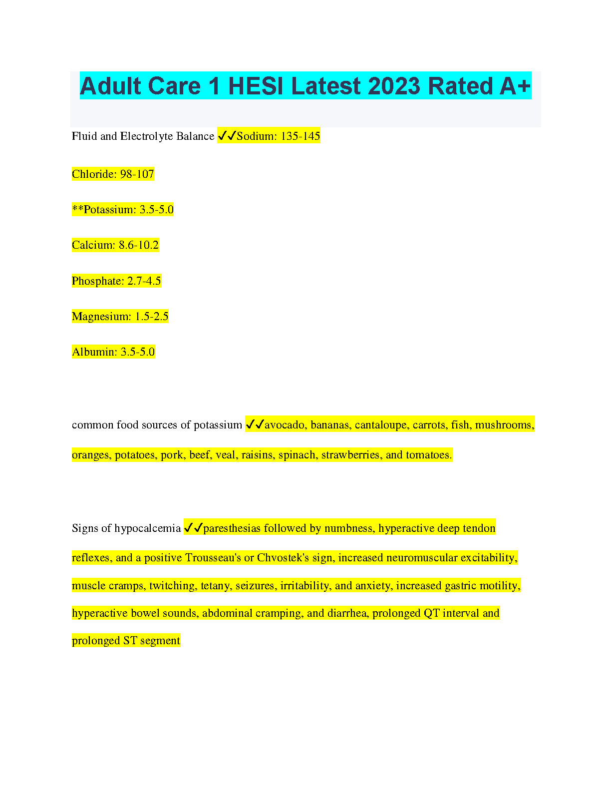 Prepare for your Adult Care 1 HESI exam with confidence! This comprehensive study guide is designed to help you master the essential concepts and achieve success on your first attempt. It covers all the key areas of adult care, including fluid and electrolyte balance, common food sources of potassium, and signs of hypocalcemia.