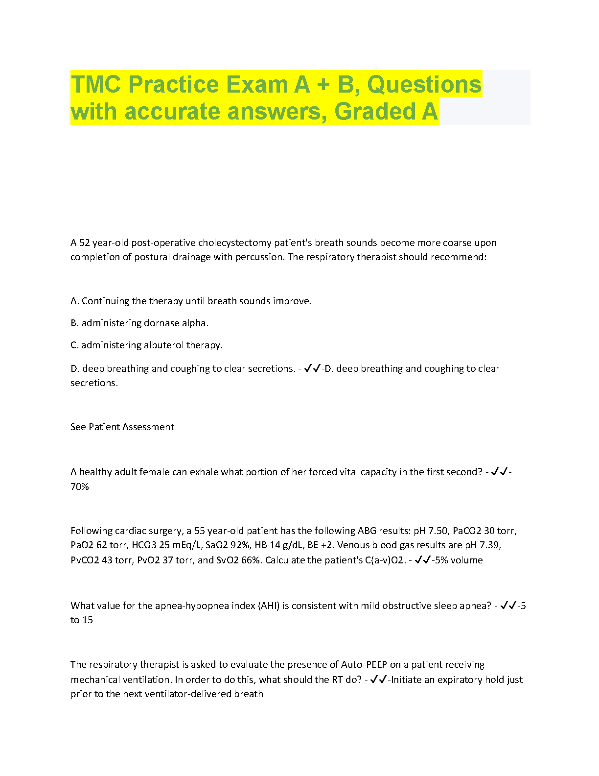 TMC Practice Exam A + B, Questions with accurate answers, Graded A is a comprehensive study guide designed to help students master the material and pass their exams on the first attempt. This resource includes multiple-choice questions and answers, along with detailed explanations to help you understand the concepts.