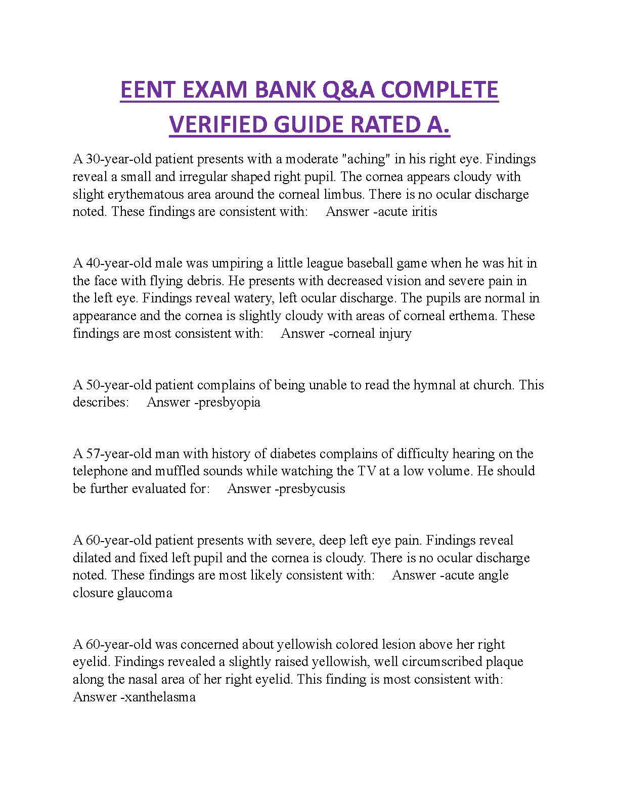 This EENT Exam Bank Q&A Complete Verified Guide Rated A. is designed to help students ace their exams and avoid resits. With comprehensive coverage of all key topics and detailed explanations, this resource is an invaluable tool for success. This exam bank includes a wide range of questions covering various topics in the field of EENT, ensuring a comprehensive and effective learning experience. Each question is carefully crafted to assess your understanding of the subject matter and prepare you for real-world scenarios. Get access to expert-written answers and explanations to gain a deeper insight into the concepts.