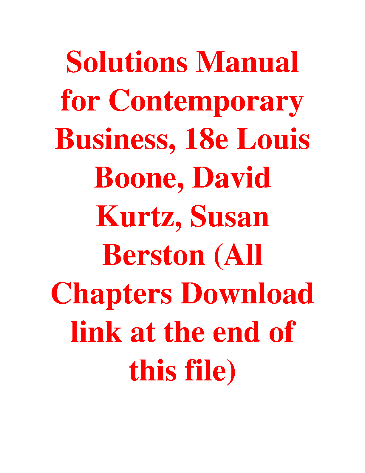 Get ready to ace your business courses with this comprehensive Solutions Manual for Contemporary Business, 18th Edition by Louis Boone, David Kurtz, and Susan Berston. This manual provides complete solutions to all textbook problems, making it an invaluable resource for students seeking to understand key concepts and improve their performance. It's your ultimate companion for mastering business principles and ensuring success in your studies.