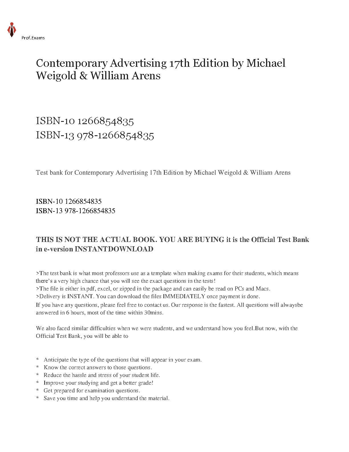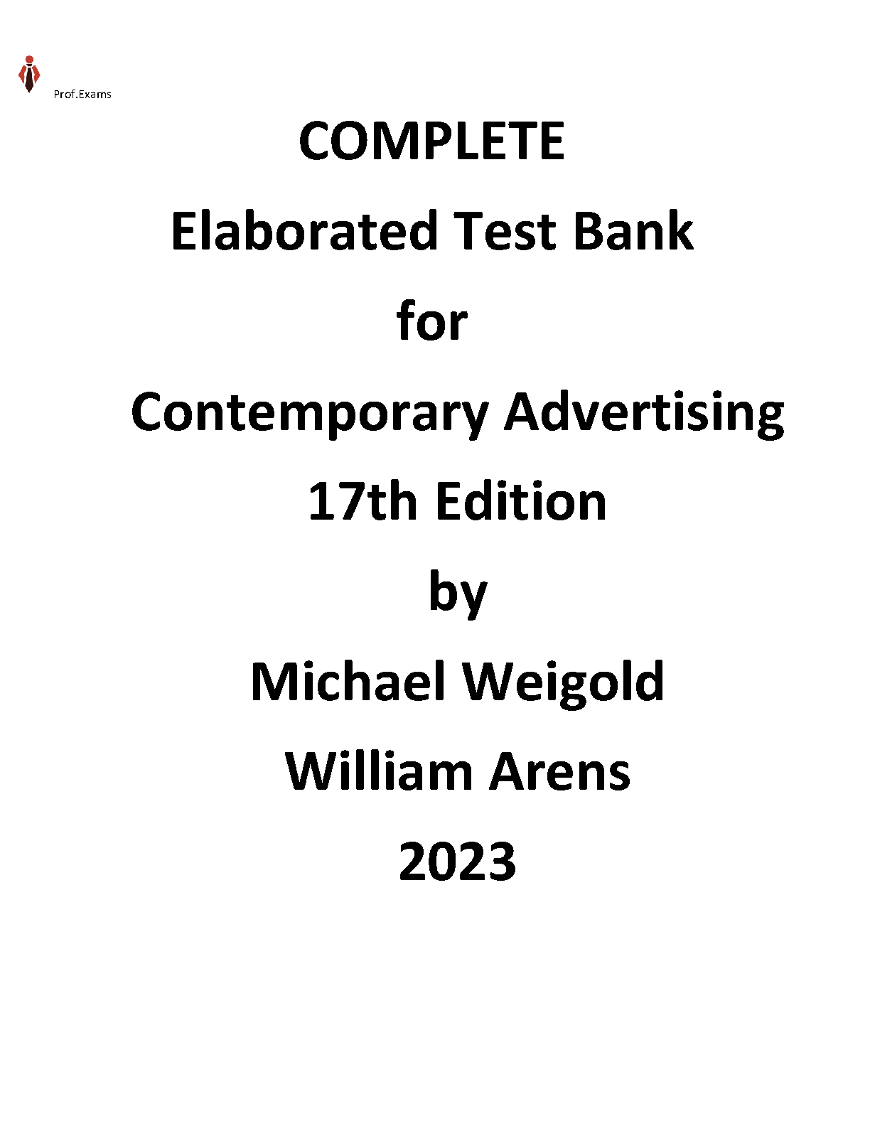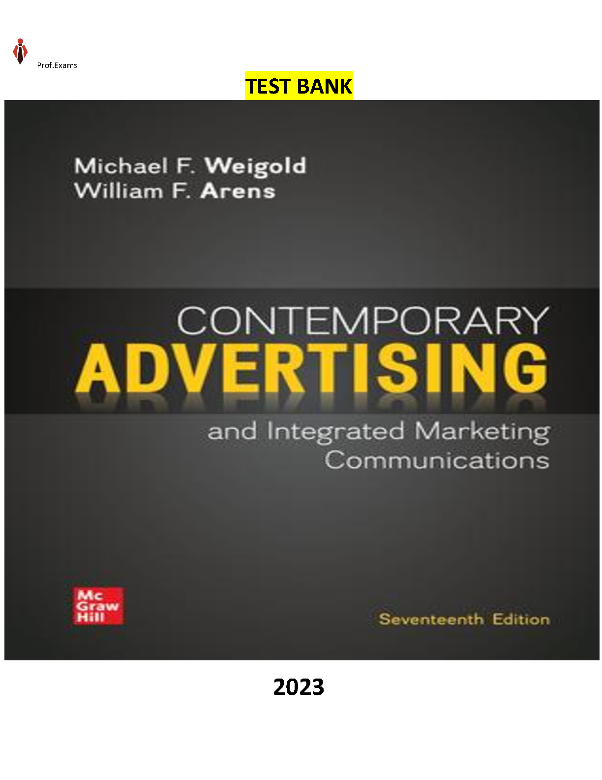 Ace your exams with this comprehensive test bank for Contemporary Advertising and Integrated Marketing Communications, 17th Edition by Michael F. Weigold and William F. Arens. This resource includes a wide range of practice questions covering all key concepts and topics, helping you solidify your understanding and improve your exam performance.
