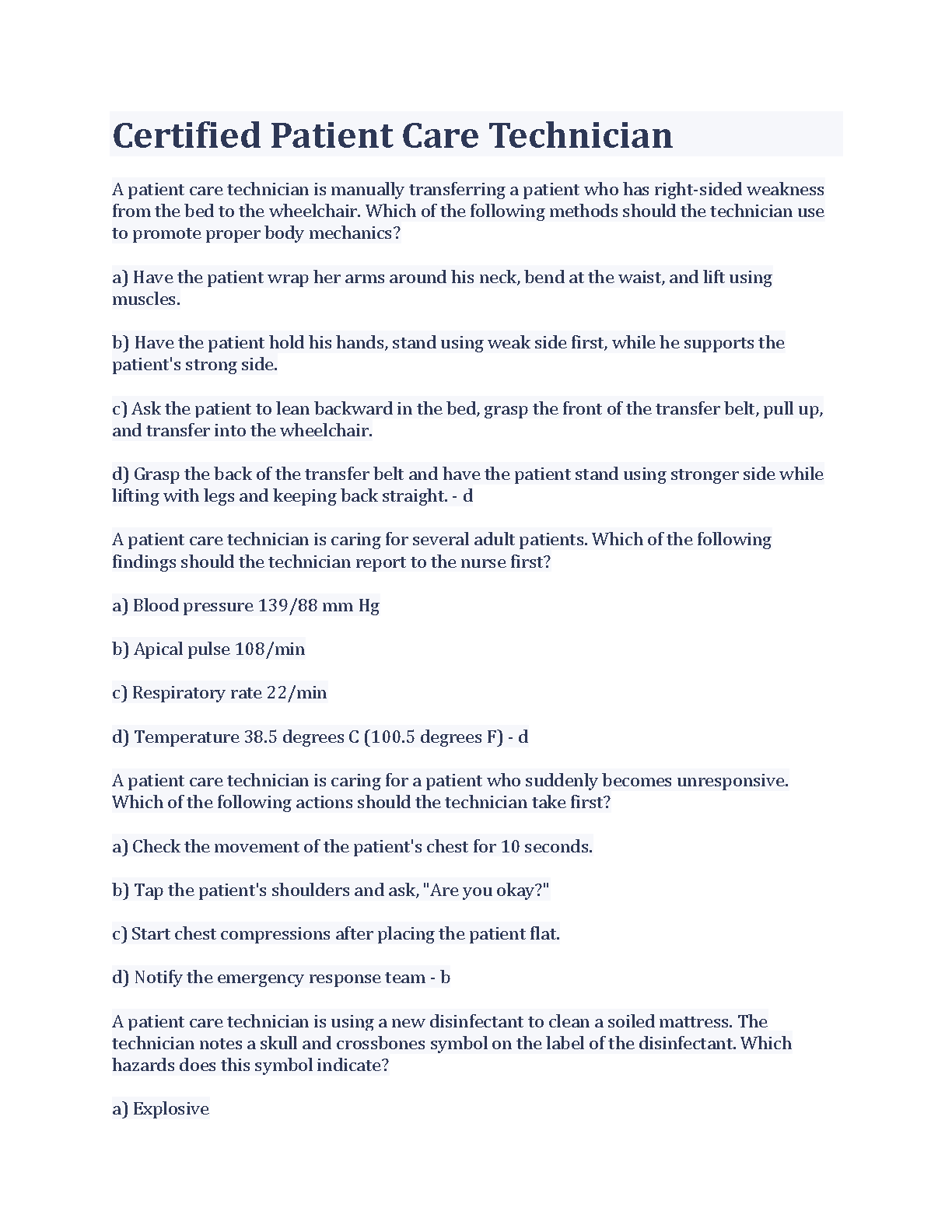 Master the essential concepts of Certified Patient Care Technician with this comprehensive exam prep guide designed to help you ace your exams on the first attempt. This resource covers all the key topics you need to know, including patient care, safety, and emergency procedures.