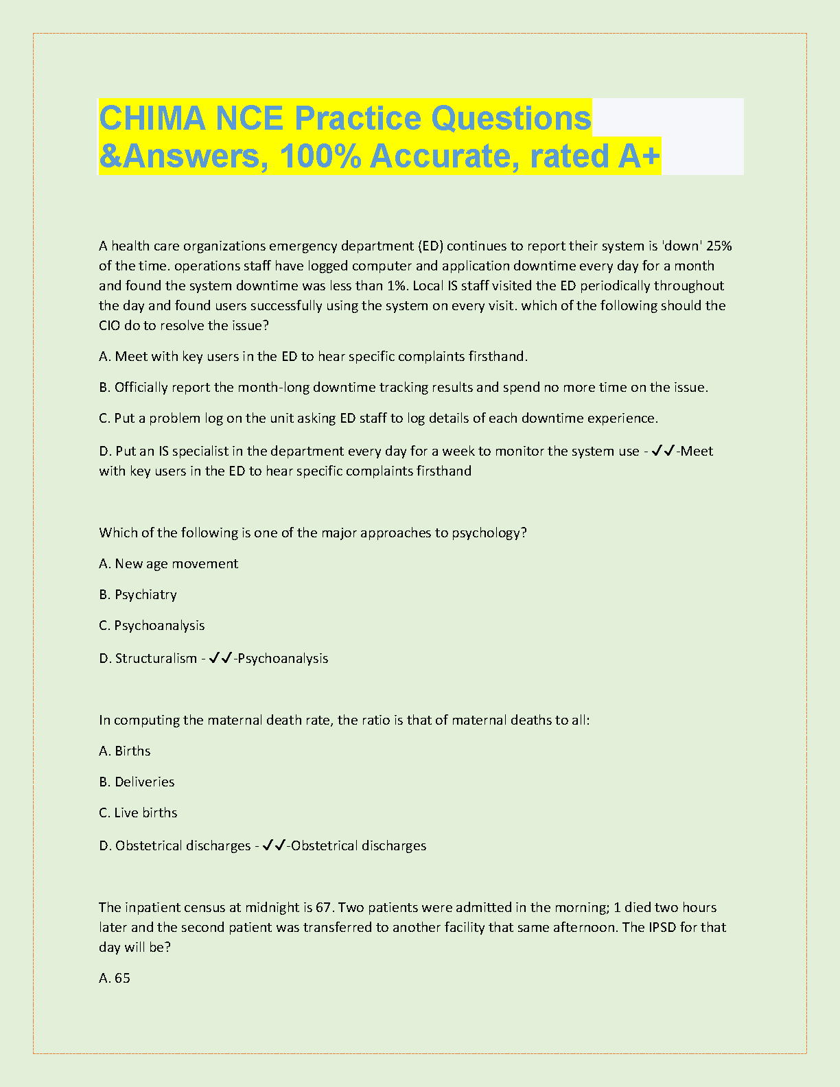 CHIMA NCE practice questions and answers are designed to help you pass your exam on the first attempt, without having to worry about resits. This comprehensive resource contains 100% accurate answers, rated A+ by industry experts. Use these questions to test your knowledge and identify areas where you need further study.