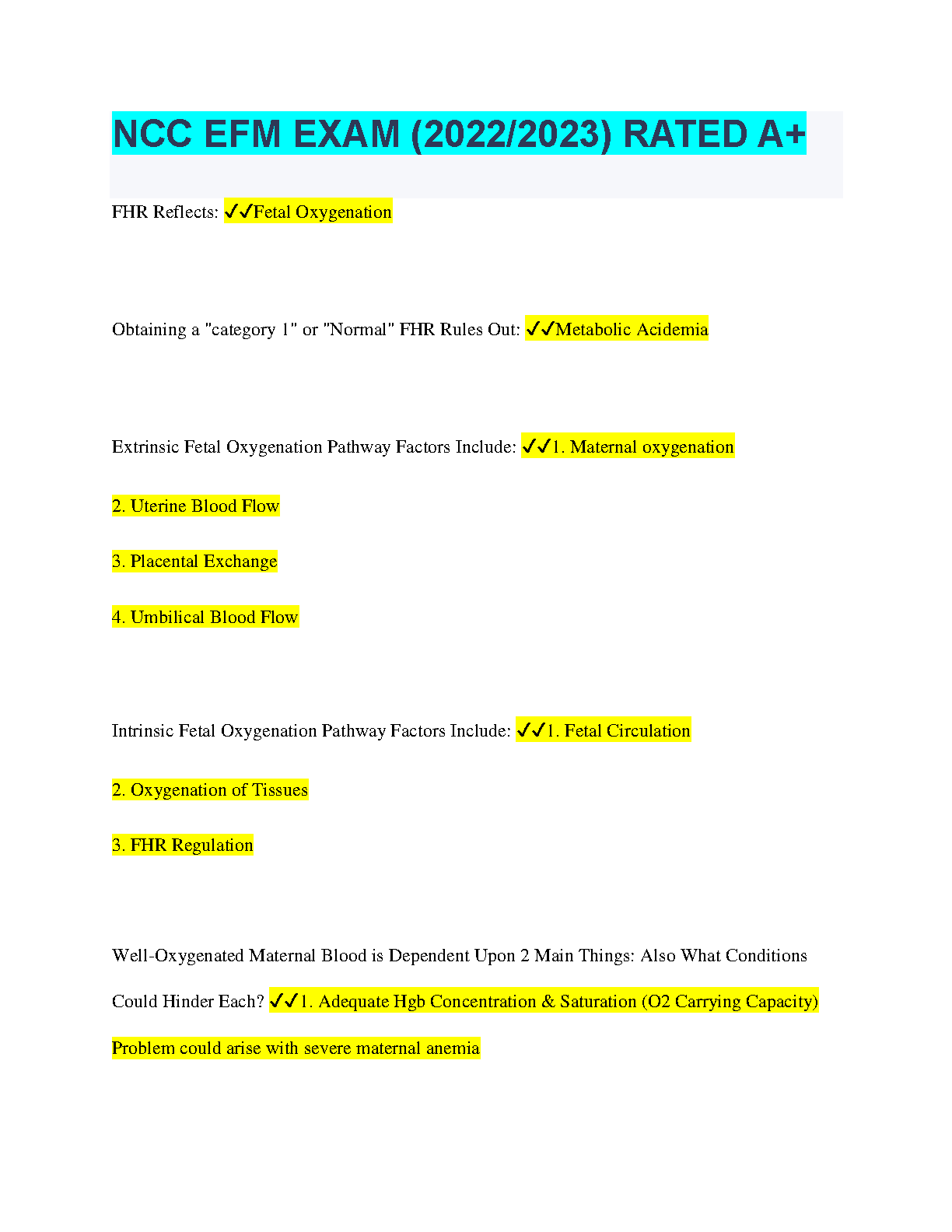This comprehensive study guide covers all the key concepts you need to know to pass your NCC EFM Exam (2022/2023). It includes everything from fetal oxygenation and maternal blood flow to fetal circulation and oxygenation of tissues. This guide is perfect for students who are looking to pass their exam on the first attempt and avoid resits.