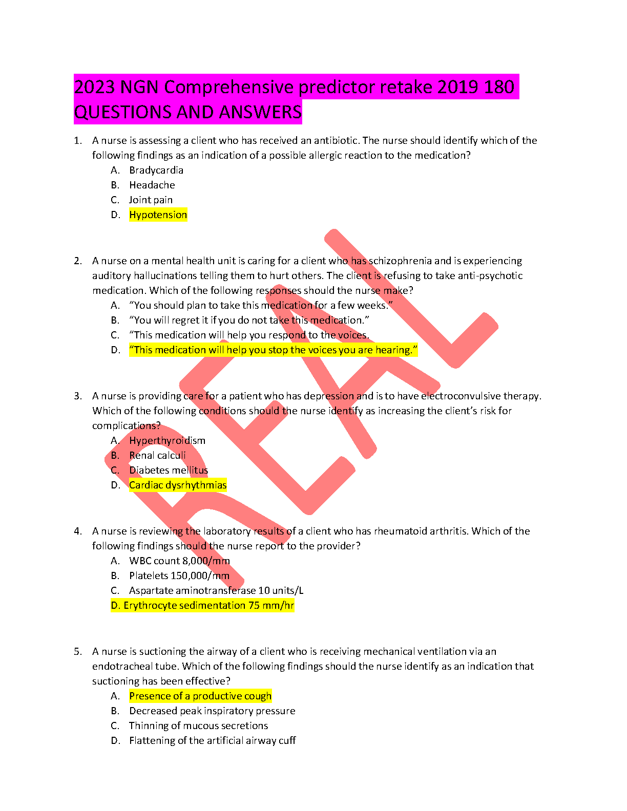 The 2023 NGN Comprehensive Predictor Retake 2019 180 Questions and Answers is a comprehensive study guide that includes 180 questions and answers. This resource is designed to help students prepare for the NGN exam and avoid resits. The questions are based on real-world scenarios and cover all aspects of the NGN curriculum.