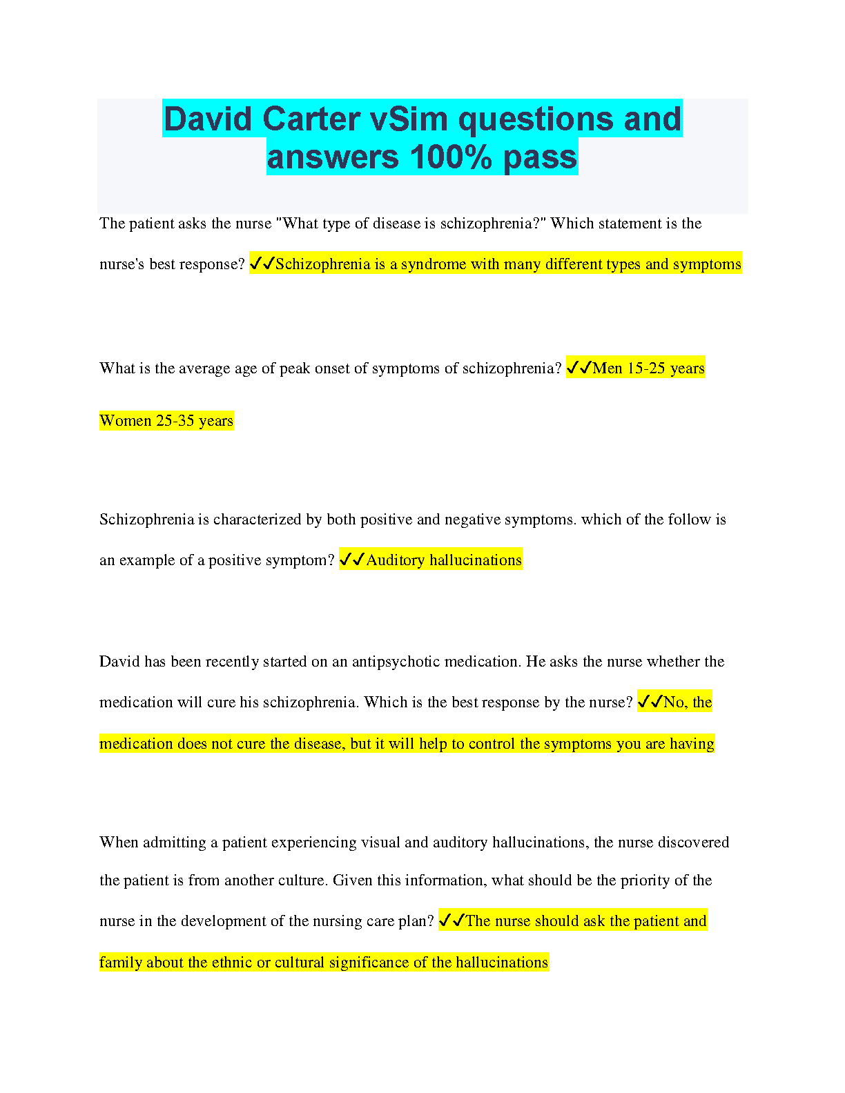 Ace your nursing exams on the first attempt with this comprehensive guide featuring David Carter vSim questions and answers, meticulously crafted to help you understand key concepts and practice effectively. This resource is tailored for the 2024/2025 academic year, ensuring you have the most up-to-date content.