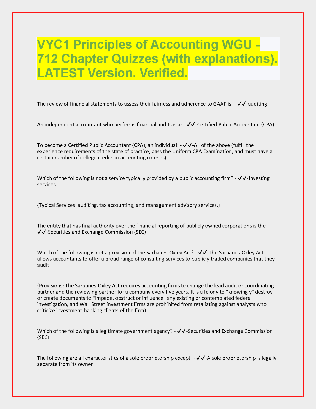 Principles of Accounting WGU - 712 Chapter Quizzes (with explanations) Latest Edition 2024-2025 - Pass Exams On First Attempt