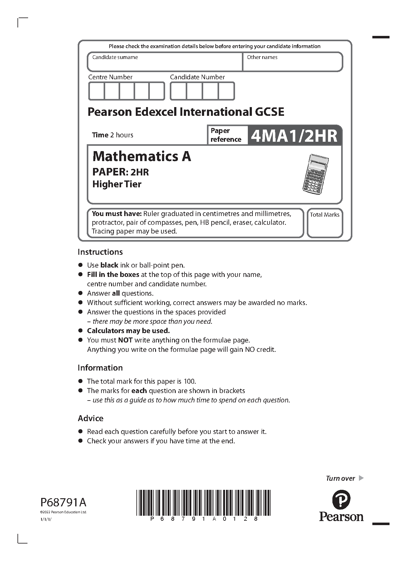 Pearson Edexcel International GCSE Mathematics A - Higher Tier - Paper 2HR - 4MA1/2HR - 2024/2025 Edition