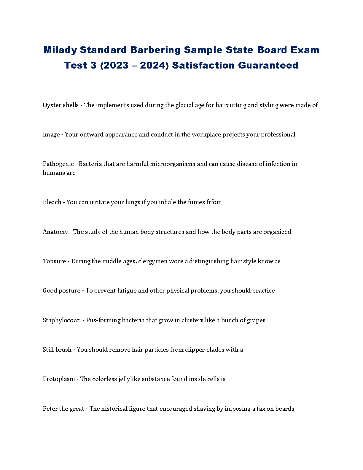 This resource offers a comprehensive overview of the knowledge and skills required for success on the Milady Standard Barbering State Board Exam. Specifically, this practice test focuses on Test 3 covering key concepts for the 2023 - 2024 academic year.