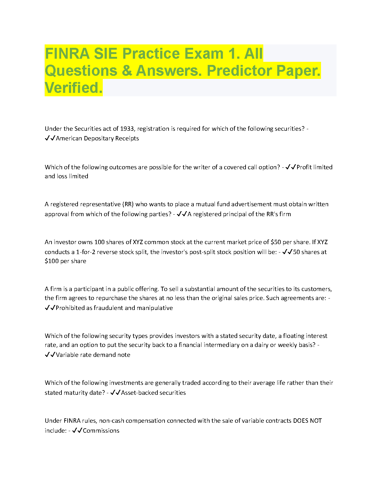 FINRA SIE Practice Exam 1. All Questions & Answers. Predictor Paper. Verified.