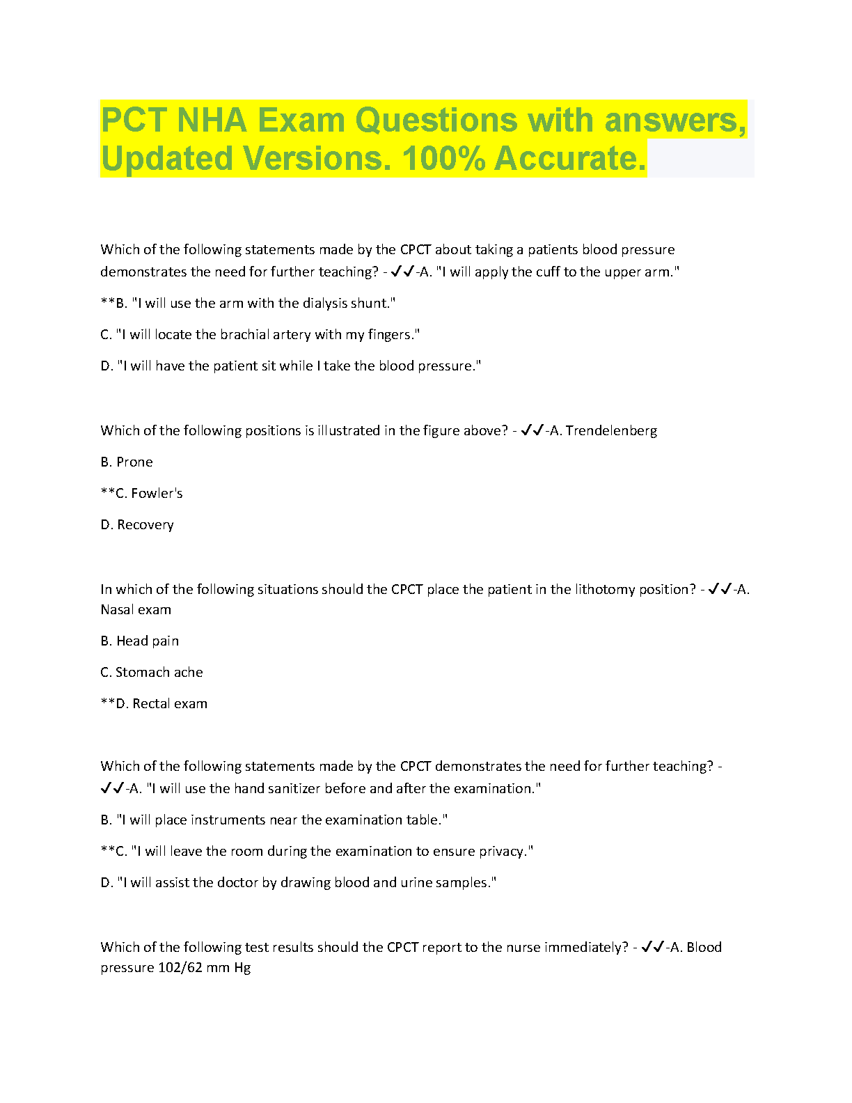 PCT NHA Exam Questions with Answers, Updated Versions. 100% Accurate.