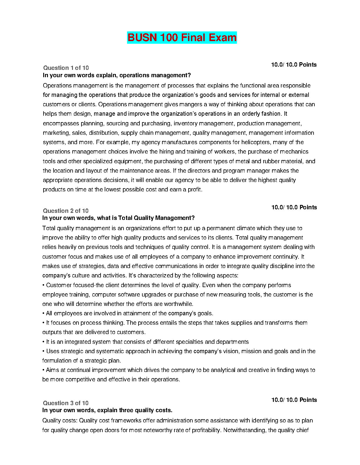 This comprehensive BUSN 100 Final Exam study guide is designed to help you ace your exam on the first attempt. It covers key concepts like Operations Management, Total Quality Management, and Quality Costs, providing you with a solid foundation for success.