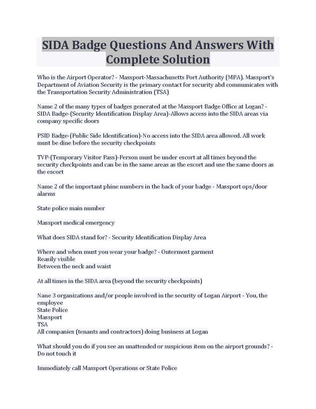 SIDA Badge Questions and Answers with Complete Solution - Massachusetts Port Authority (MPA)