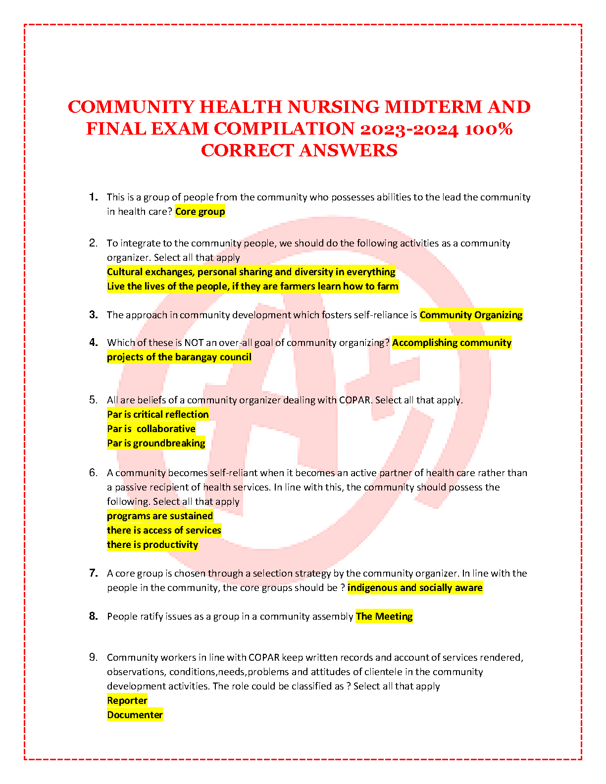 This study guide provides a comprehensive collection of midterm and final exam questions and answers for Community Health Nursing courses, encompassing the academic year 2023-2024. The guide is designed to assist students in achieving a thorough understanding of core concepts, ensuring high performance and minimizing the risk of resits.