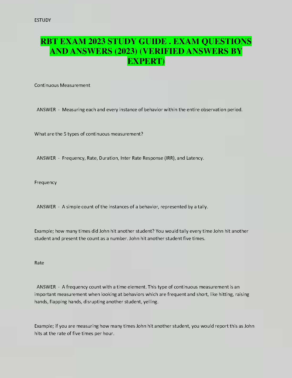RBT Exam 2023 Study Guide: Exam Questions and Answers (2023) (Verified Answers by Expert)