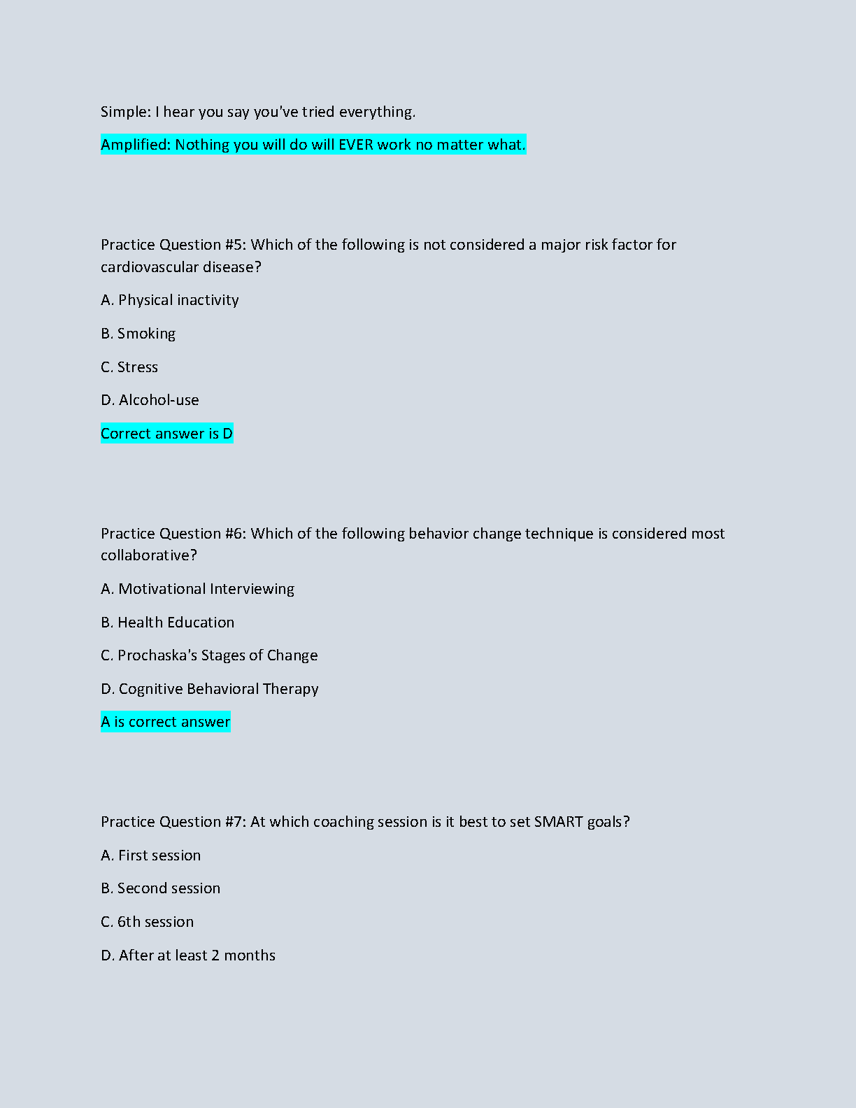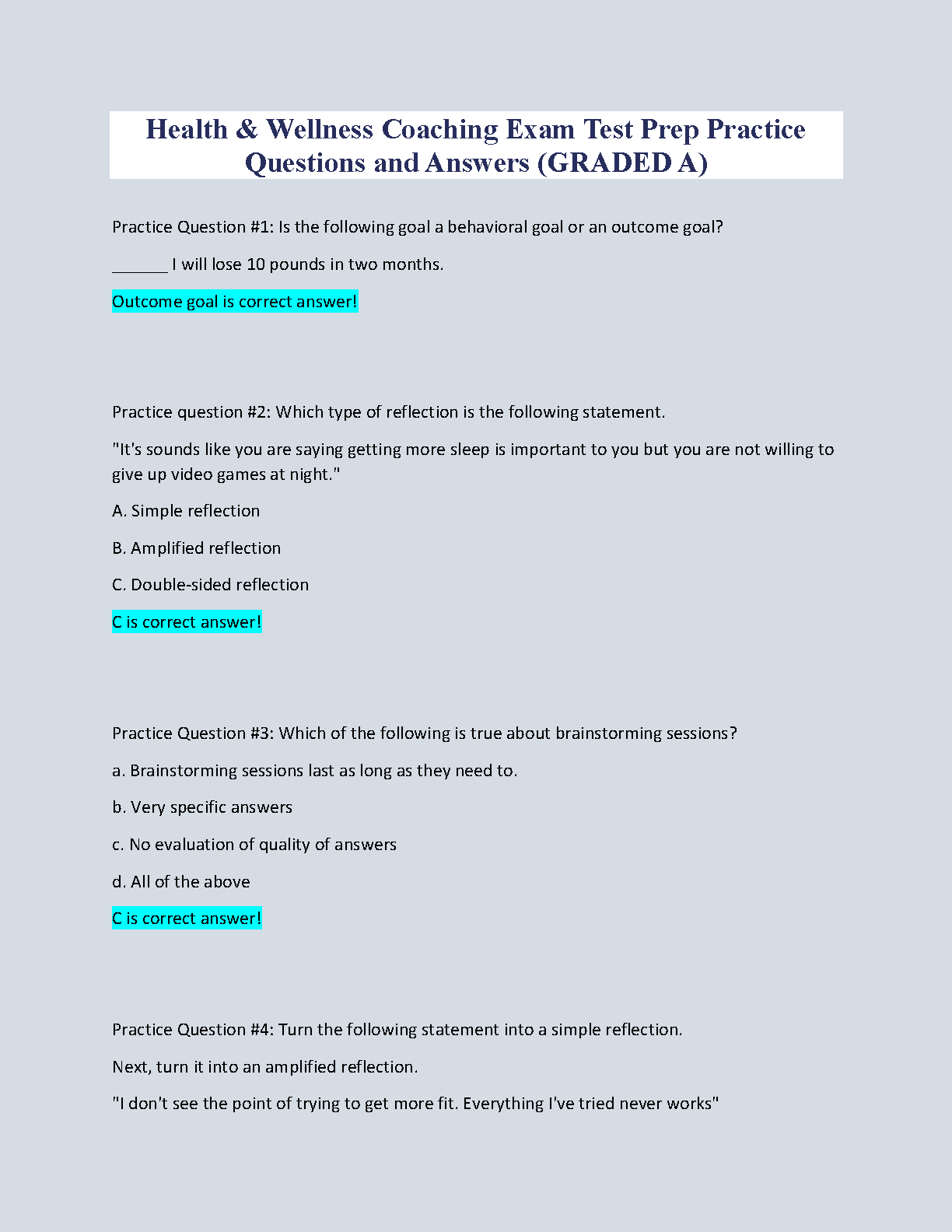 Prepare for your Health and Wellness Coaching Exam with this graded practice test. This resource includes practice questions covering a range of topics, including behavioral goals, outcome goals, reflections, and brainstorming sessions. Get ready to ace your exam with this comprehensive study guide.