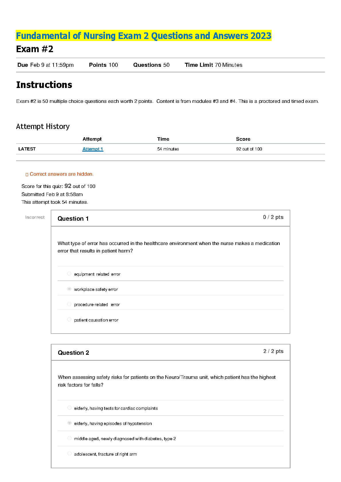Fundamentals of Nursing Exam 2 Questions and Answers 2023 - Edition 1 by Unknown Author