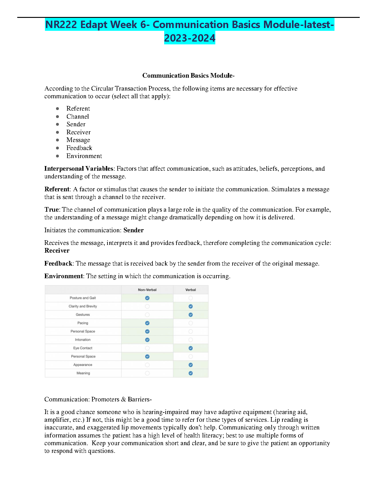 NR222 Edapt Week 6 - Communication Basics Module: Latest Edition for 2023-2024