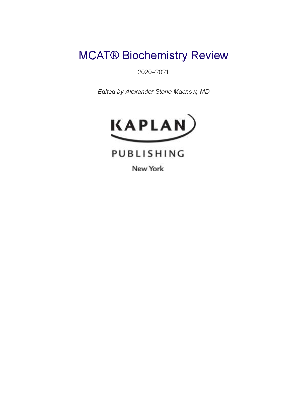 Kaplan MCAT Biochemistry Review 2020-2021 Edition by Seth A. O'Donnell, Raymond A. G. Moser, Julie A. Zwick, James S. Cutts, Thomas J. Coffey, and Michael D. McDaniel