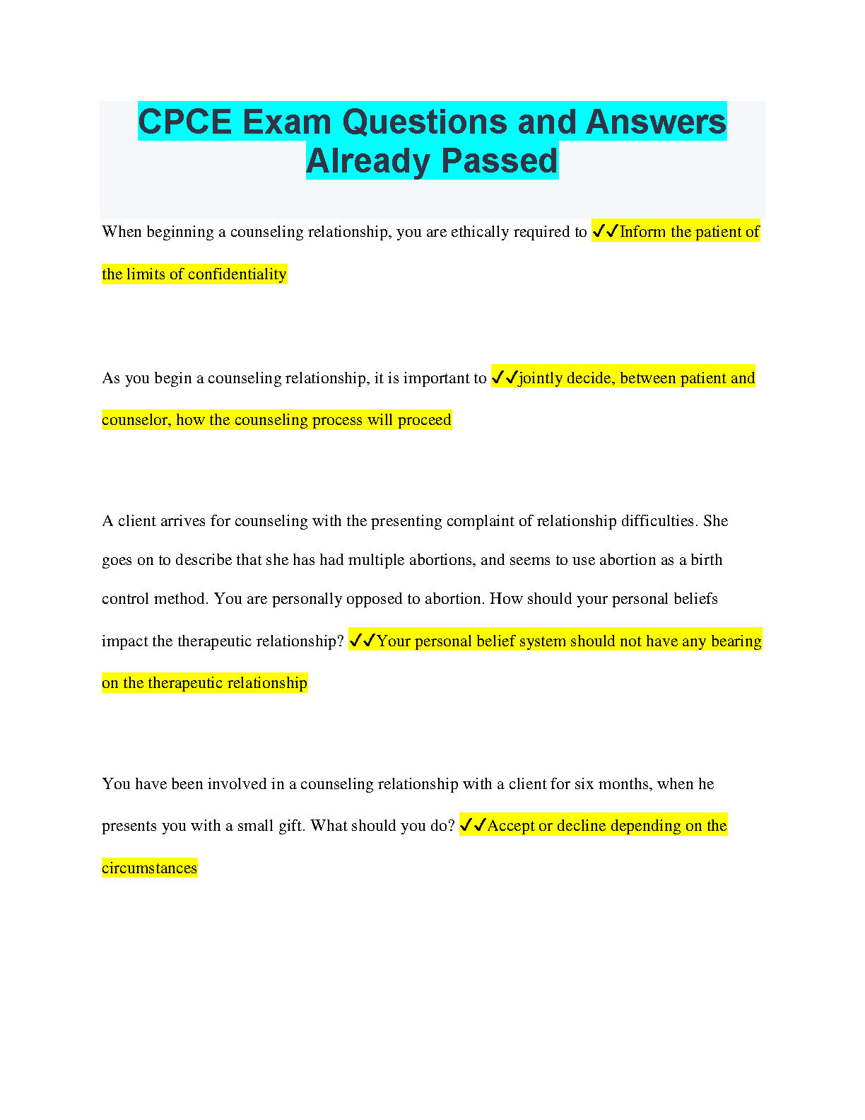 CPCE Exam Questions and Answers is a valuable resource for students preparing for the Certified Professional Counselor Exam (CPCE) for the 2024/2025 academic year. This comprehensive guide features a range of practice questions covering essential CPCE topics to help you prepare for exam success.