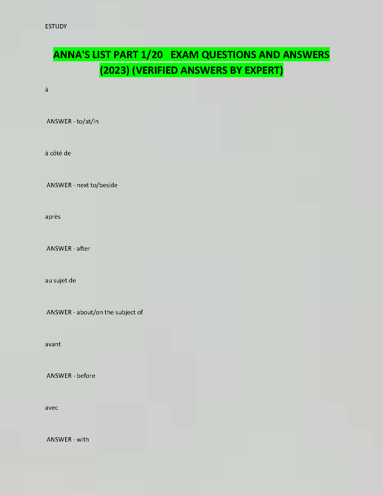 Ace your exams with Anna's List Part 1/20 Exam Questions and Answers (2023) verified by experts. This resource provides a comprehensive collection of practice questions and answers to help you master the material and achieve exam success.