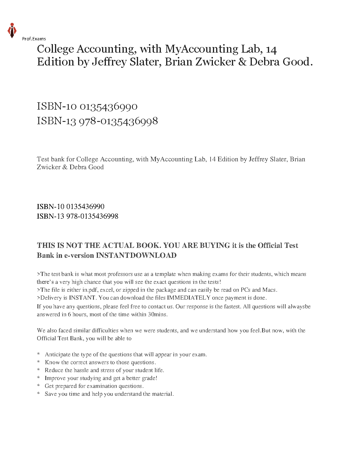 Ace your college accounting exams with this comprehensive Test Bank for College Accounting: A Practical Approach, 16th Canadian Edition by Jeffrey Slater and Debra Good. Get access to hundreds of practice questions covering all key concepts, ensuring you're fully prepared for any assessment. Download now and boost your confidence for a top score!