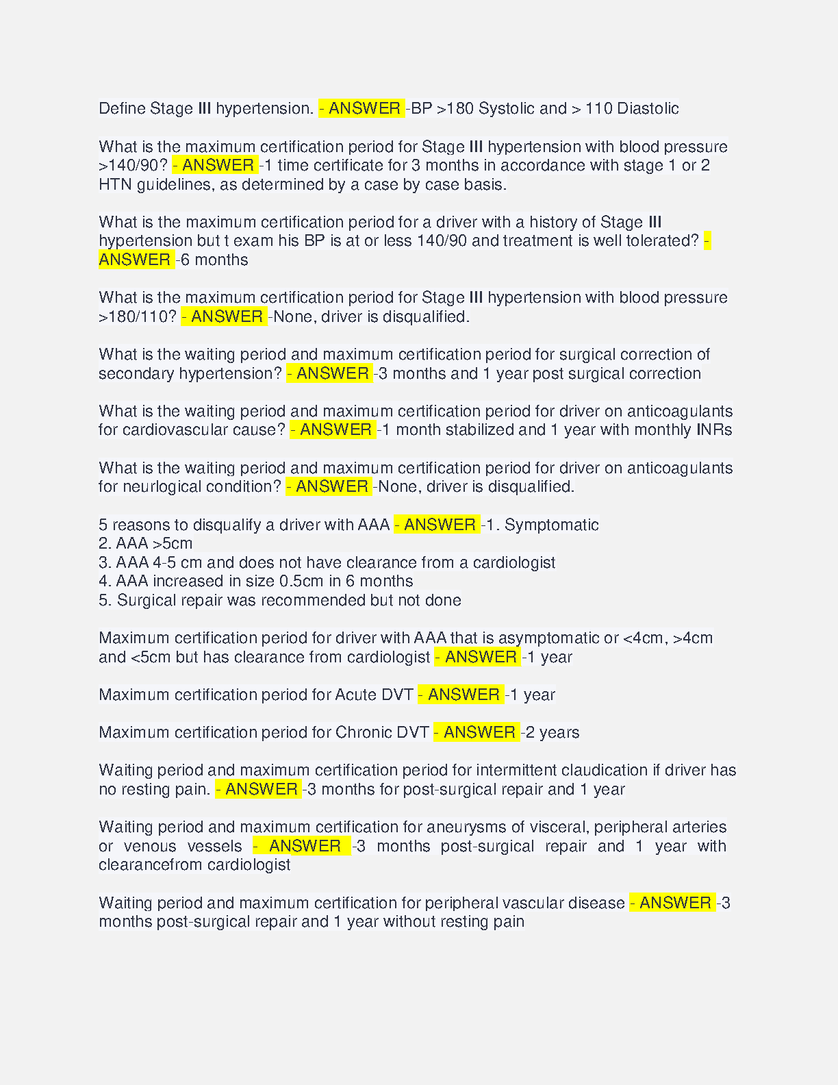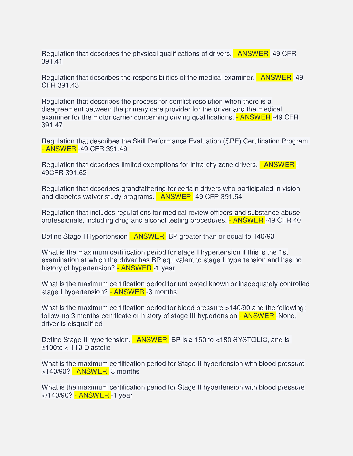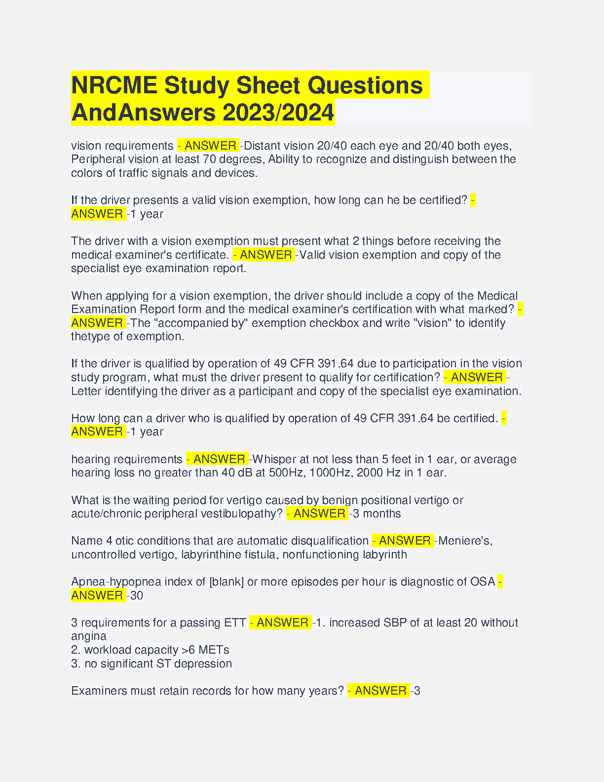 This study sheet contains questions and answers for the NRCME exam. It covers topics such as vision requirements, hearing requirements, and vertigo. It is ideal for students preparing for the NRCME exam.