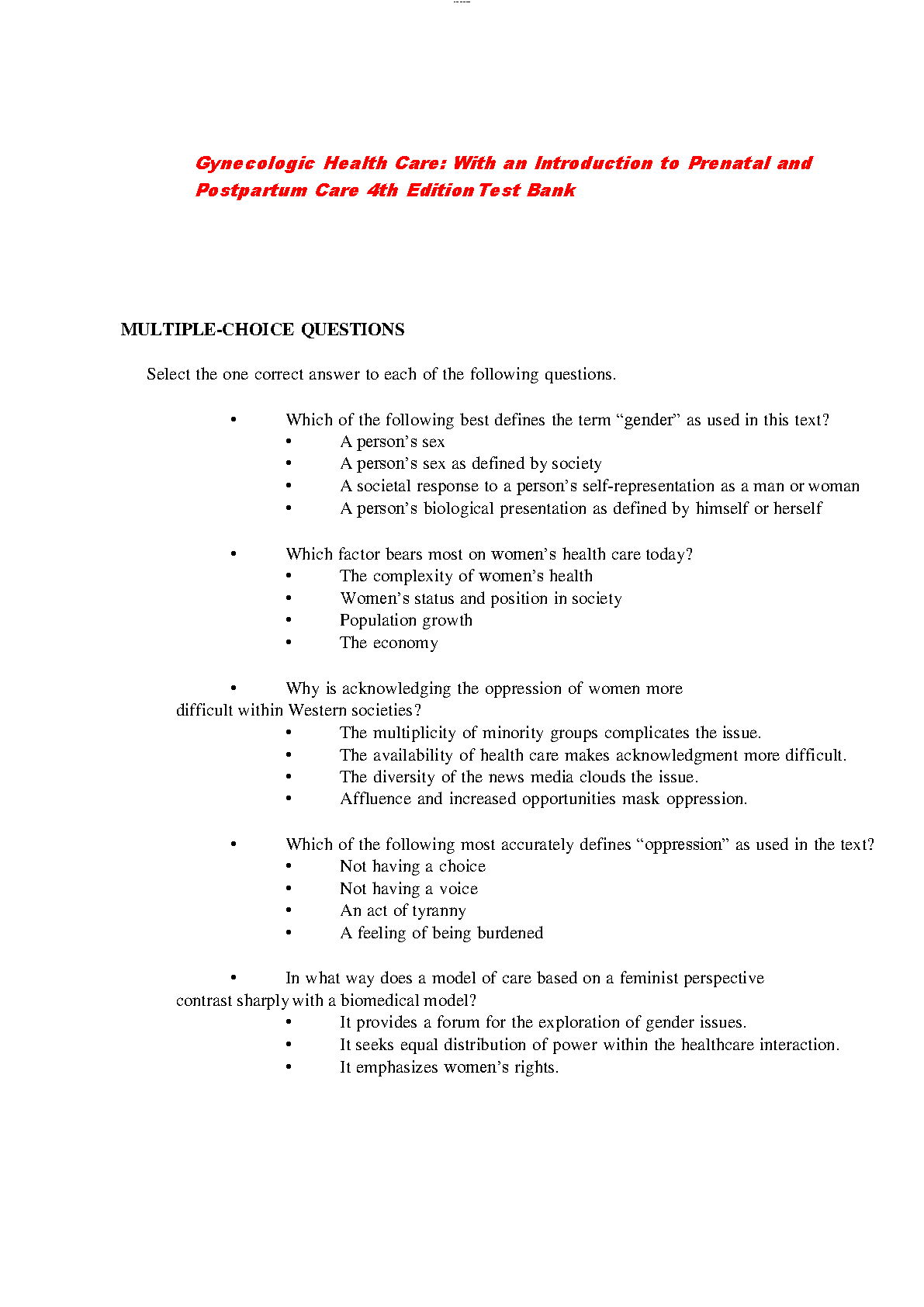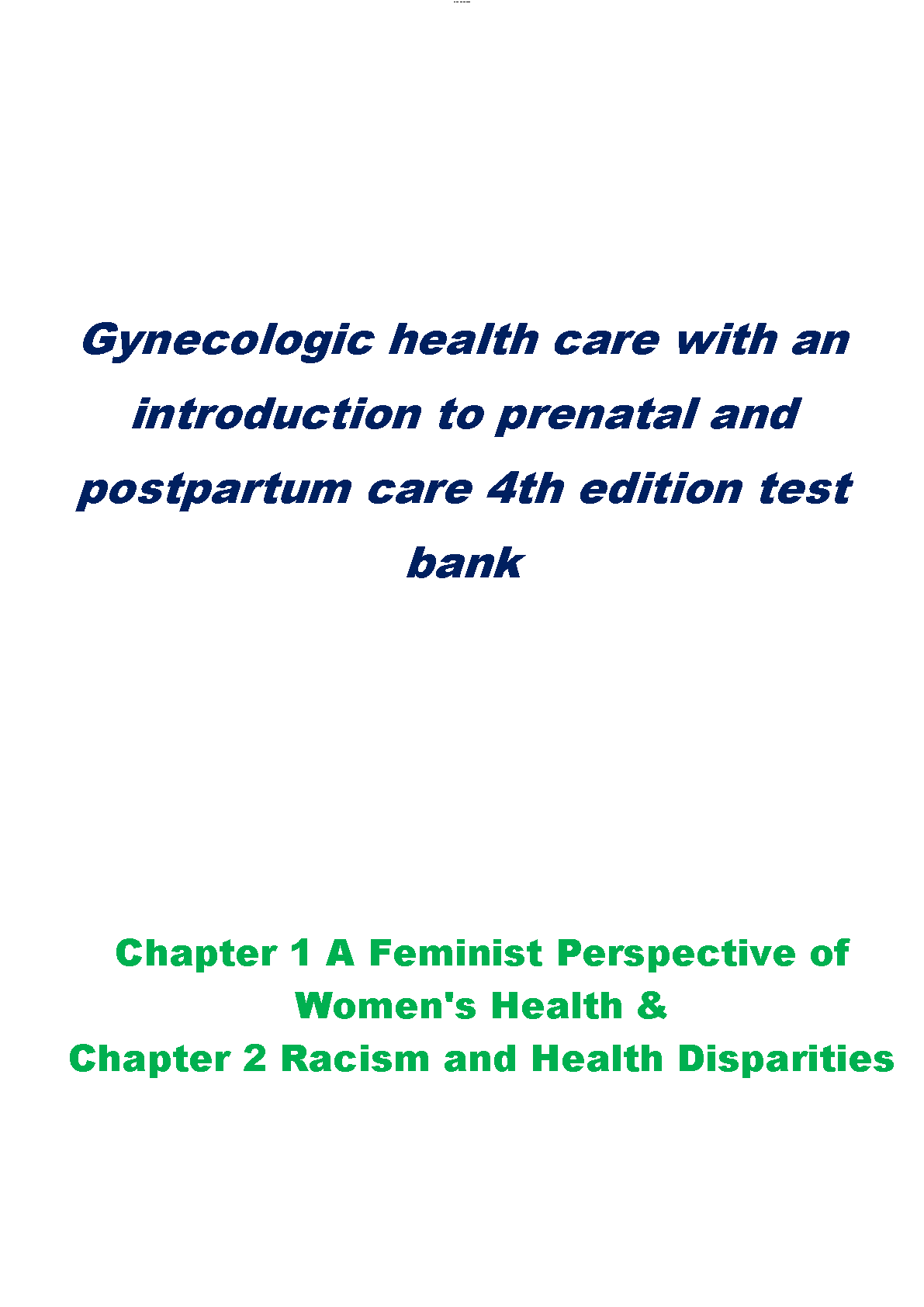 Gynecologic Health Care With An Introduction To Prenatal And Postpartum Care 4th Edition Test Bank by Roberta B. Spangler, Patricia A. Laudenslager, Brenda K. McNulty, Kimberly K. Hoffman
